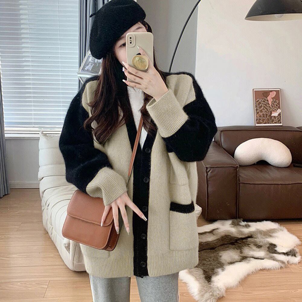 ニットカーディガン秋冬ノーカラーアウター レディース ニットアウター 配色 ゆったり 長袖ニットセーター おしゃれ 体型カバー 韓国 大人カジュアルニットトップス Vネックニット開襟 冬服 バイカラー ニット羽織り着やせ