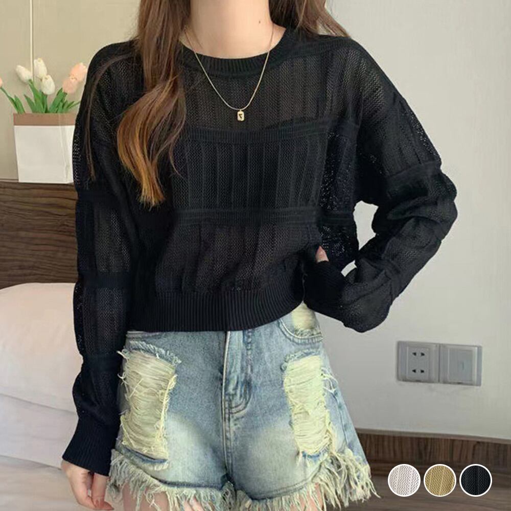 透かし編み 長袖ニットトップス 韓国風