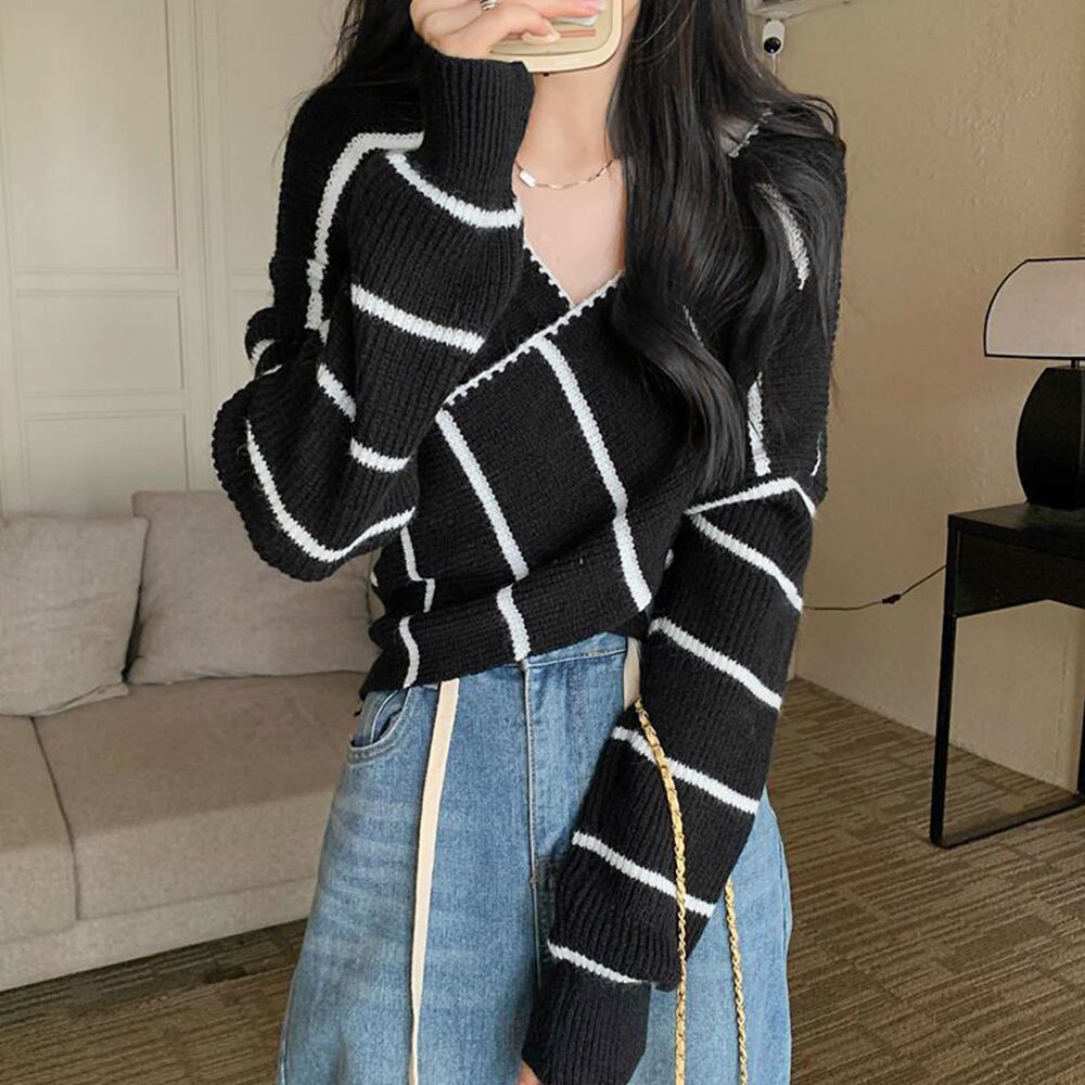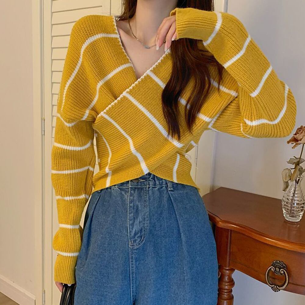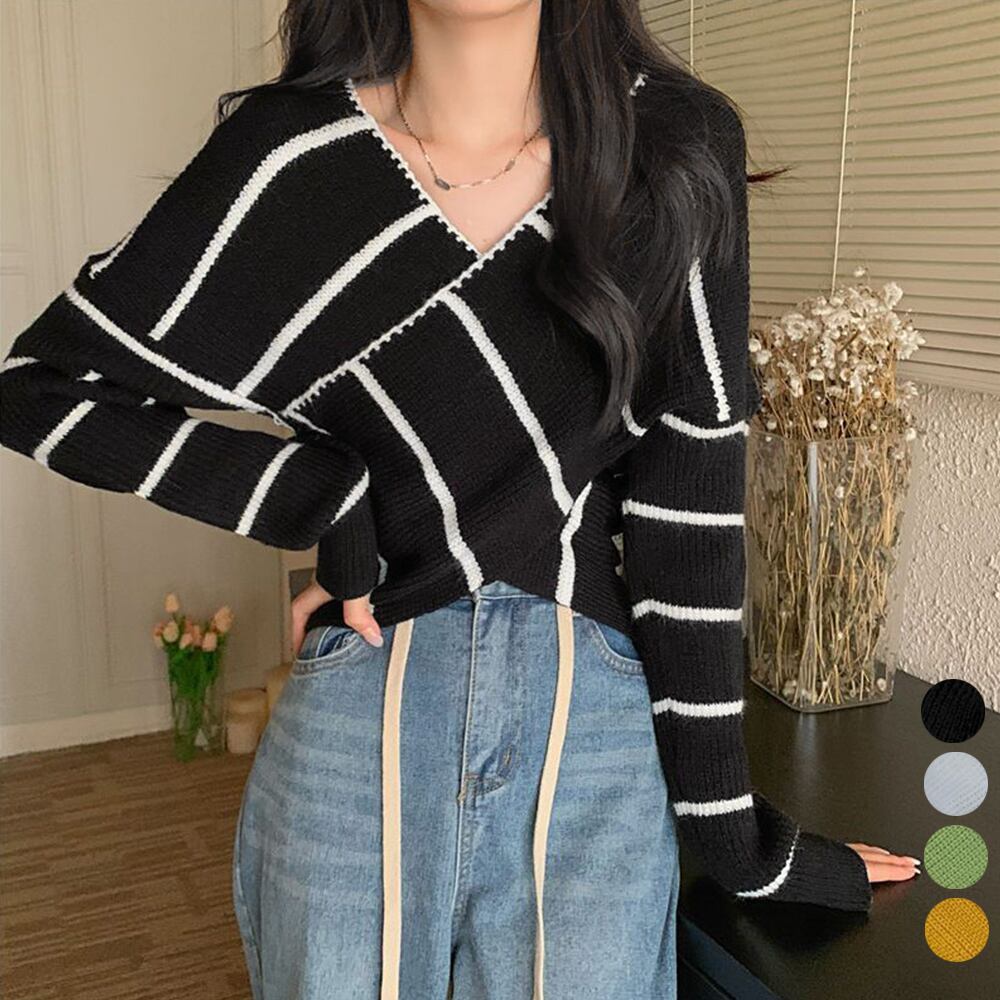 フロントのクロスデザインがウエストをすっきりと見せてくれ、Vネックの開きで顔周りはシャープな印象を与えてくれるニットトップス