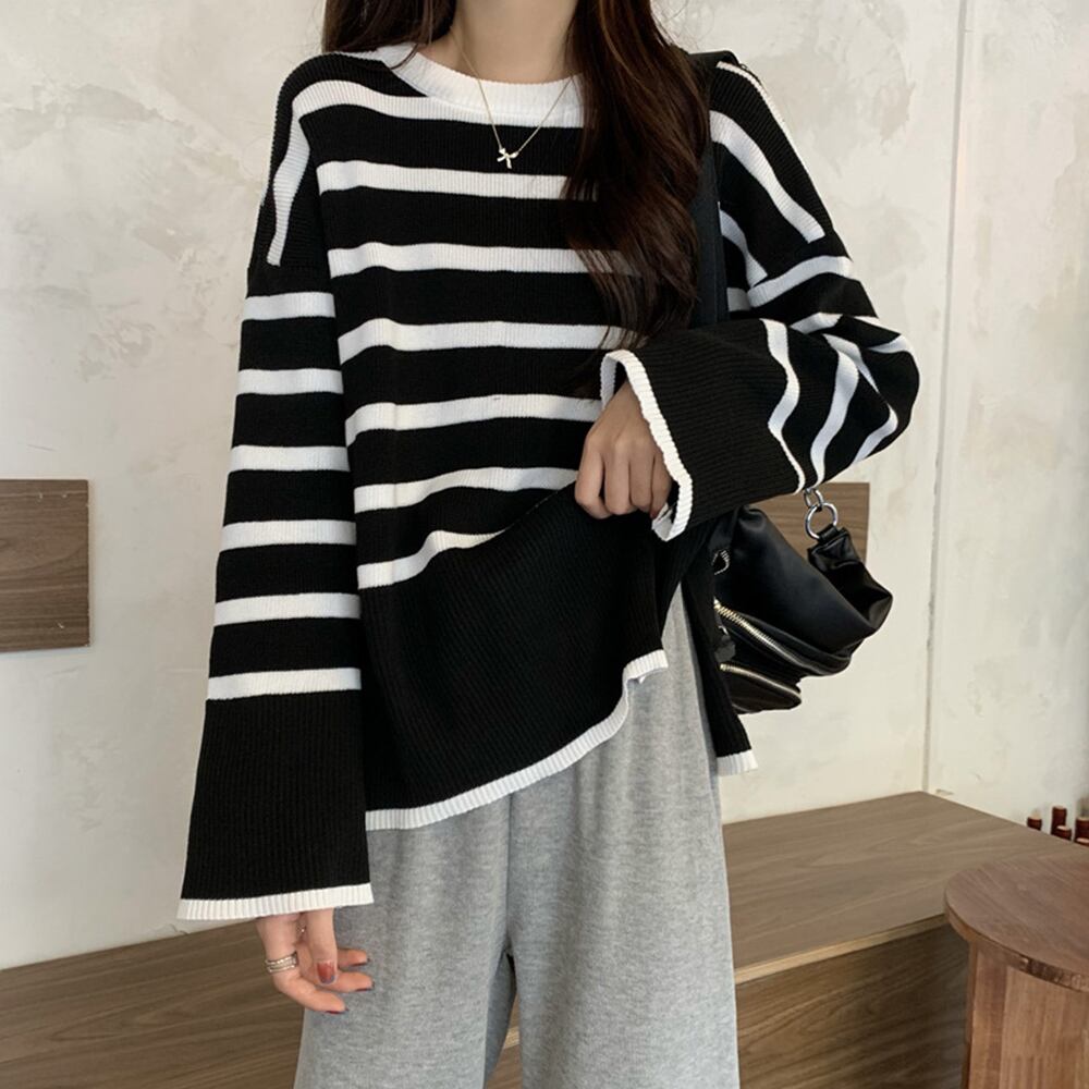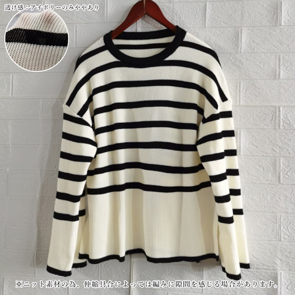 ボーダー柄ニットトップス サイドスリット