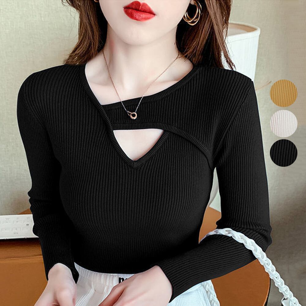 カットソー 着やせ タイト レディース デコルテ開き 重ね着 韓国風 プルオーバー シンプル 肌見せ 穴あき 普段着