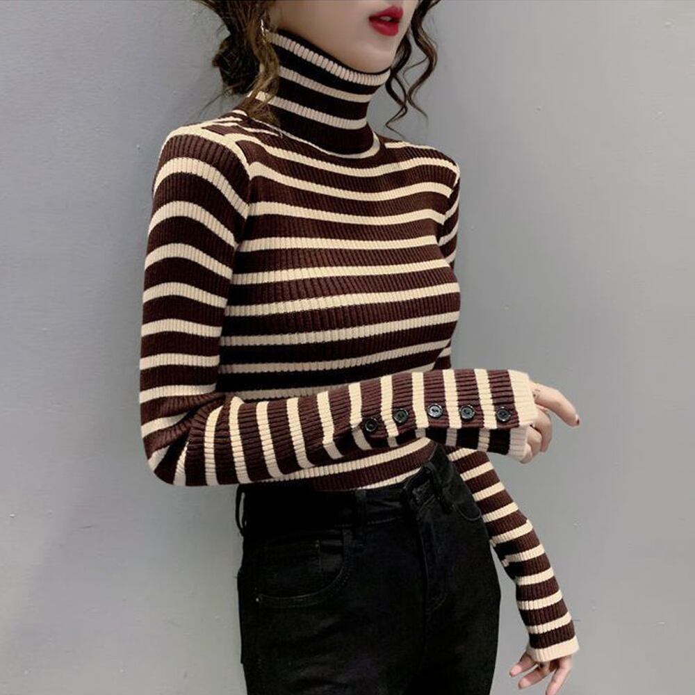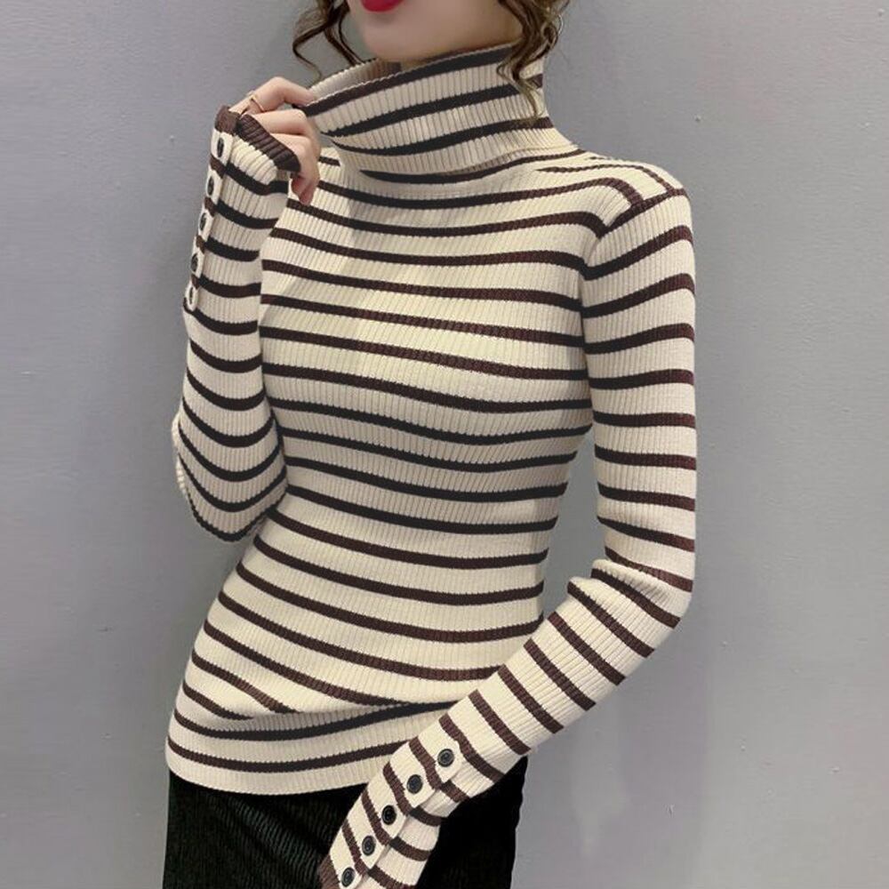 トレンドのボダン付きデザインを袖に施したタートルネックリブニットトップス