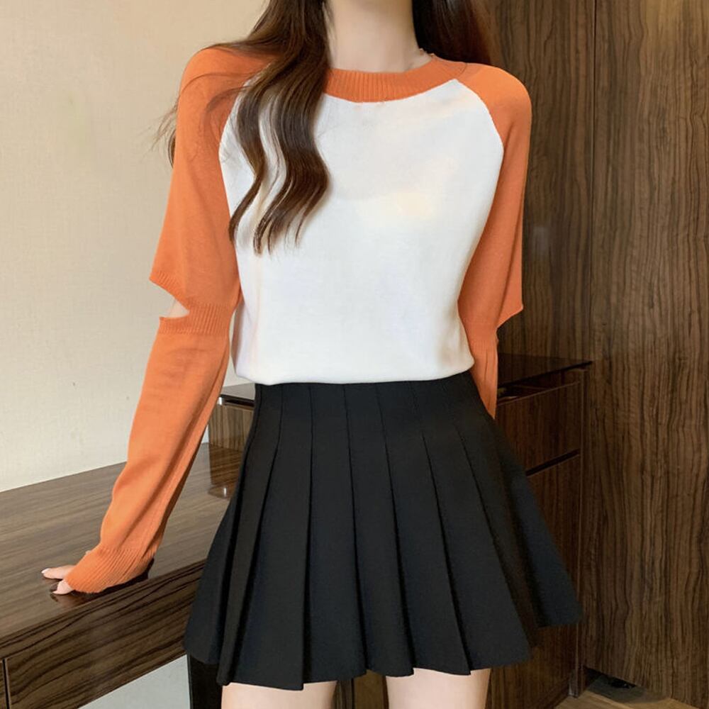 ラウンドネック 韓国風ニットウェア バイカラー レディース ニットプルオーバー 重ね着 通勤通学ニットソー カジュアル