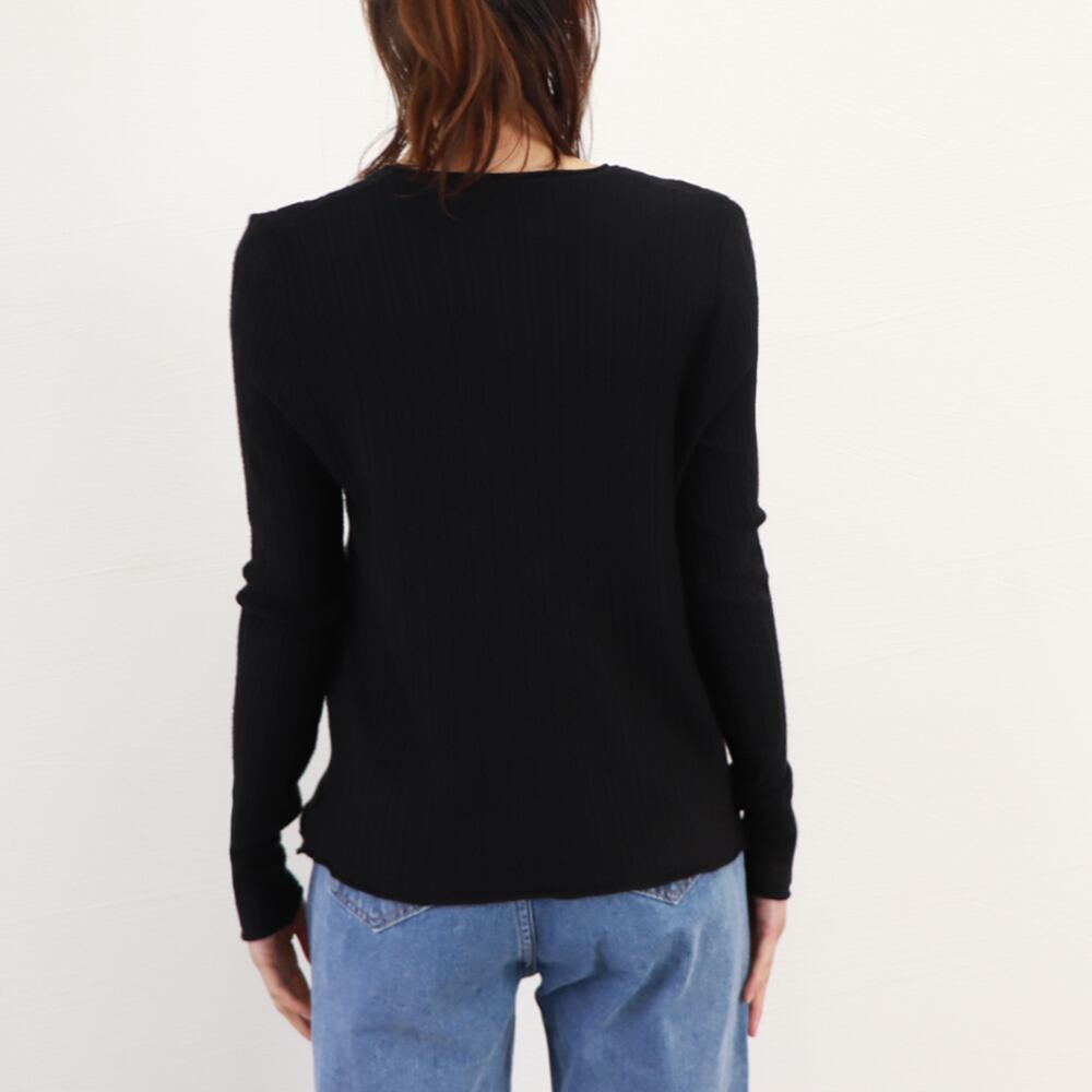 シンプルなシルエットなので、どんなボトムやアウターとも合わせやすいリブニット