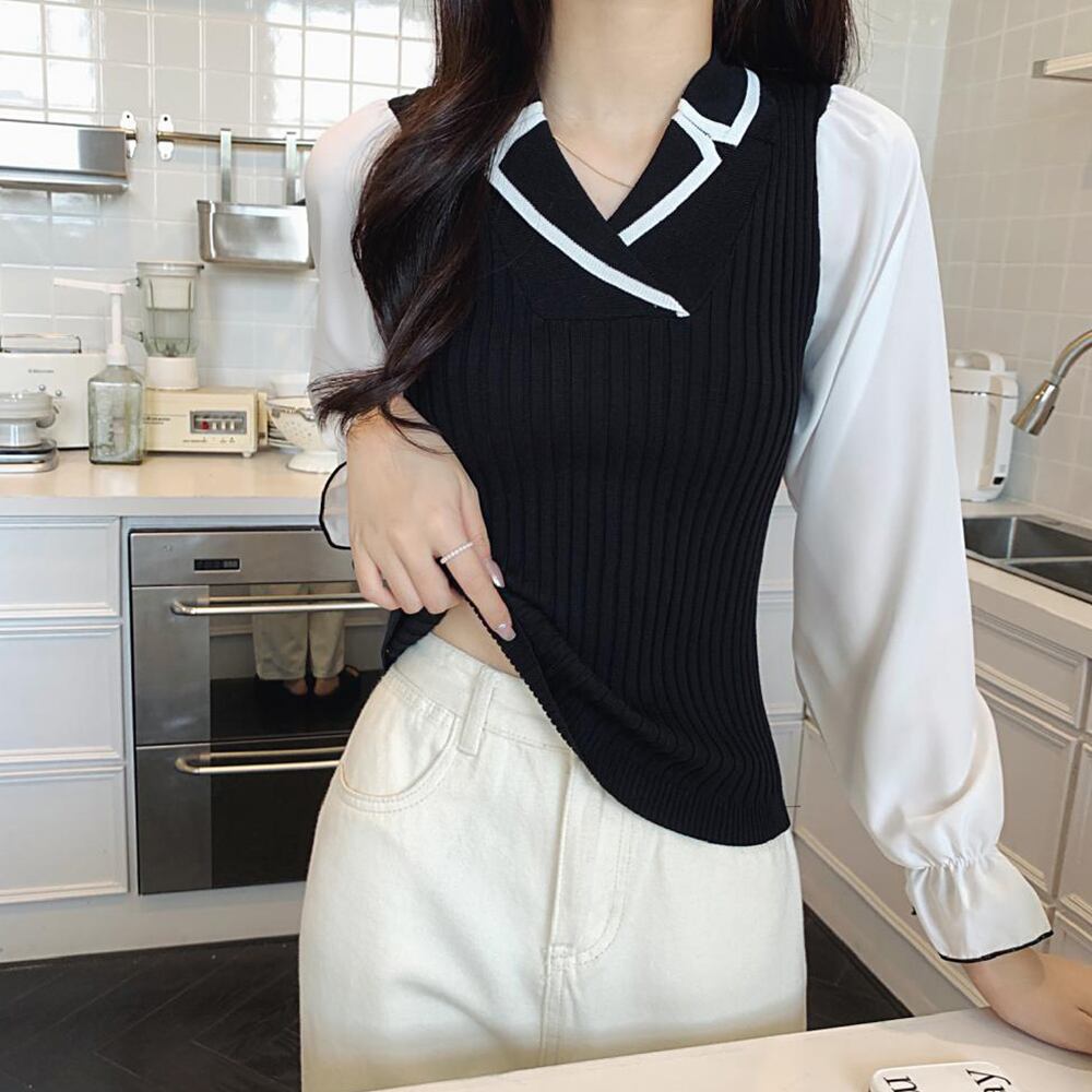 レディース トップス vネック ニットソー 着やせ カジュアル ドッキングニット きれいめ ニットウェア