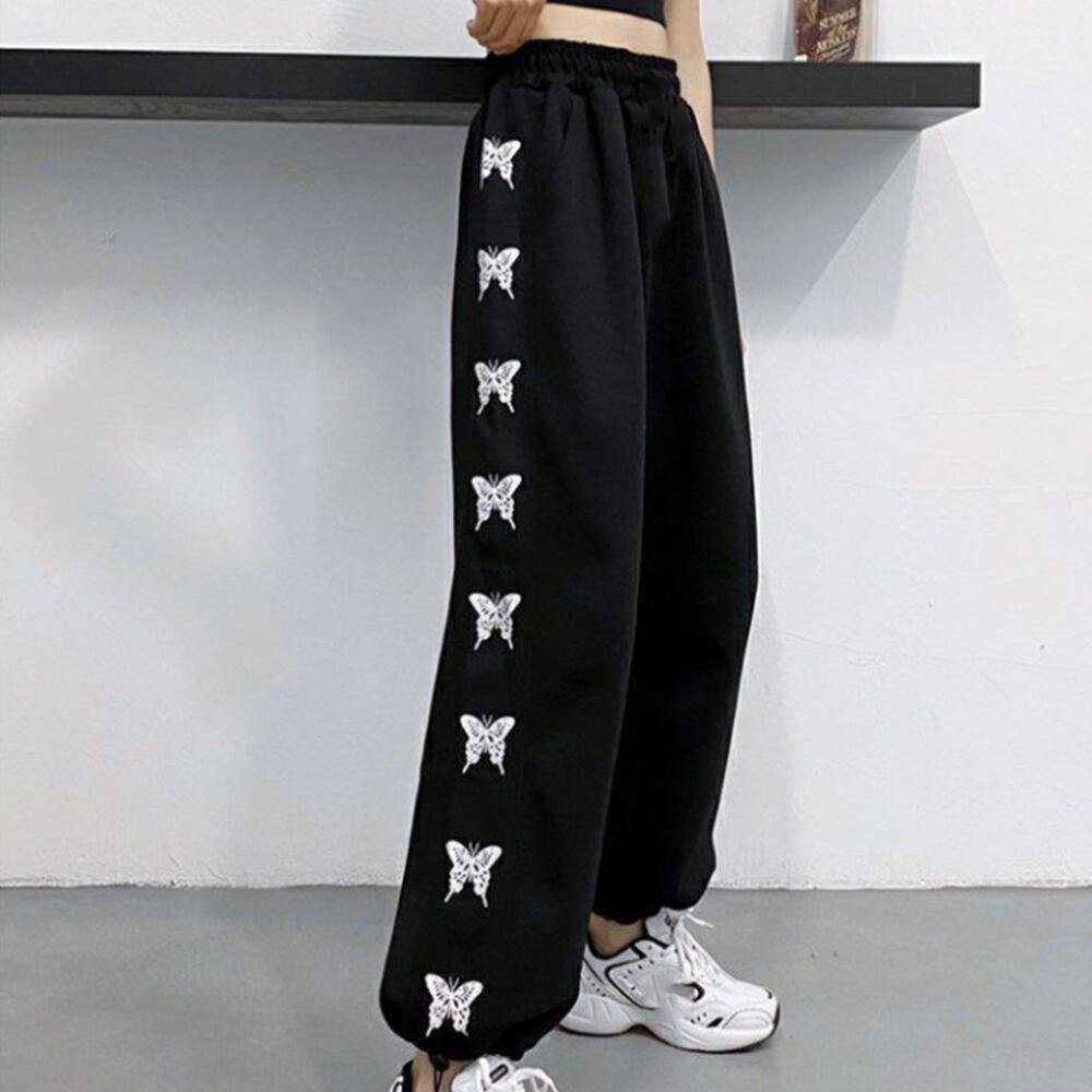 ロングパンツ レディース 韓国 サイドライン ドローストリング ジャージ 蝶々 ハイウエスト ワイドパンツ ゆったり