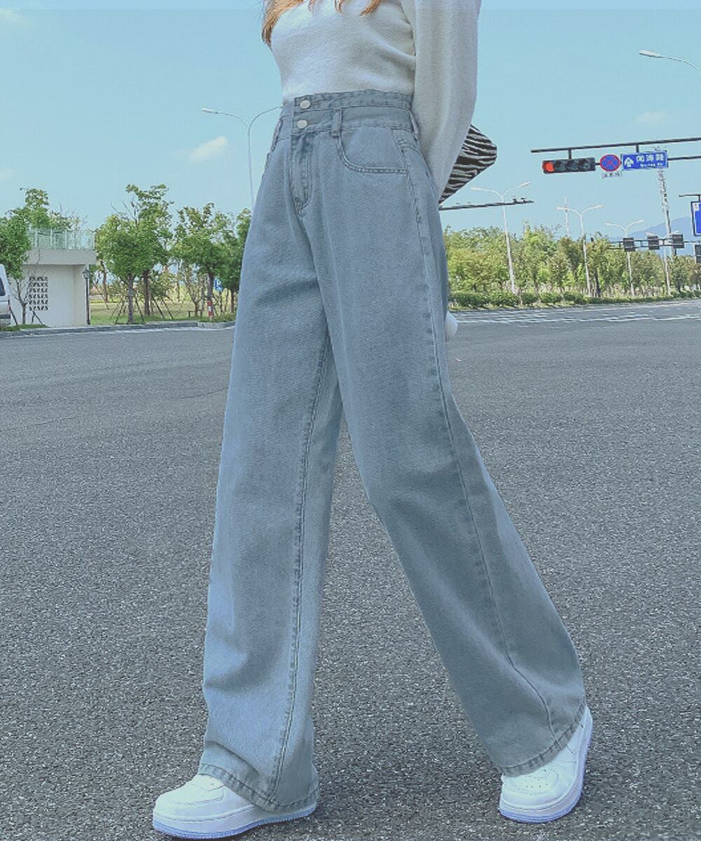 セミワイドパンツ レディース ジーパン 細見え ロングパンツ 2ボタン ズボン カジュアル 韓国ファッション
