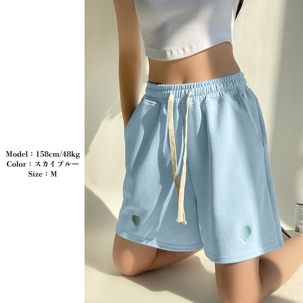 レディースボトムス 韓国 ハート刺しゅう ショーパン ウエストゴム 美脚 可愛い 体型カバー スポーツ ルームウエア 夏