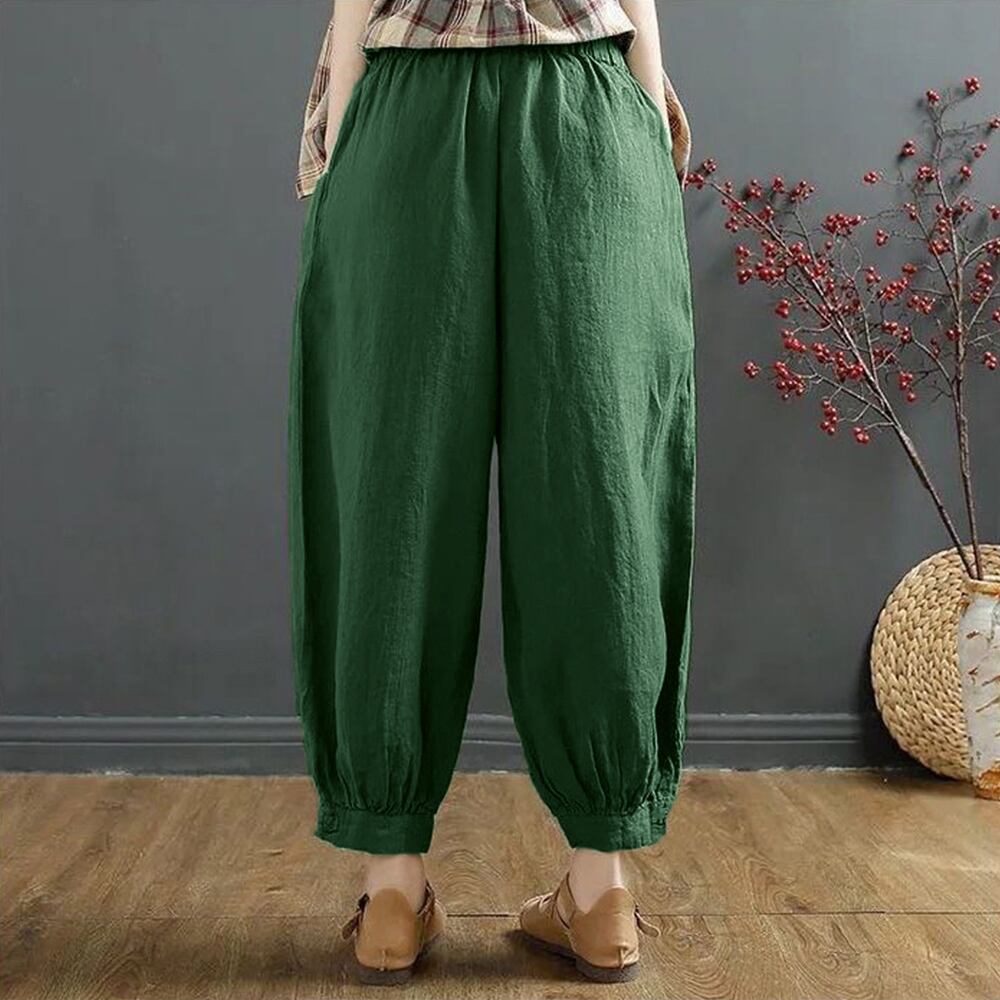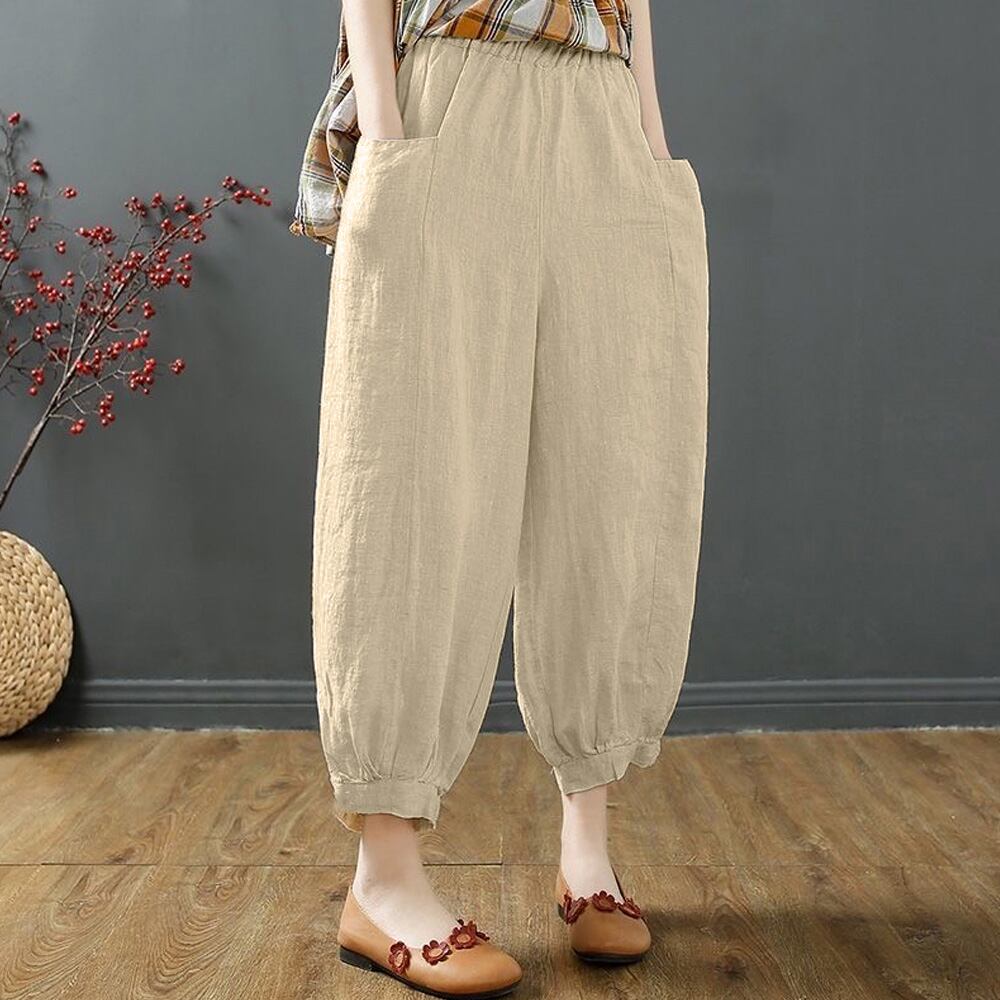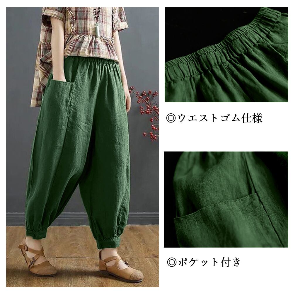 リネンパンツ ウエストゴム 着やせ パンツ ゆったり ポケット付き 九分丈パンツ カジュアル クロップドパンツ