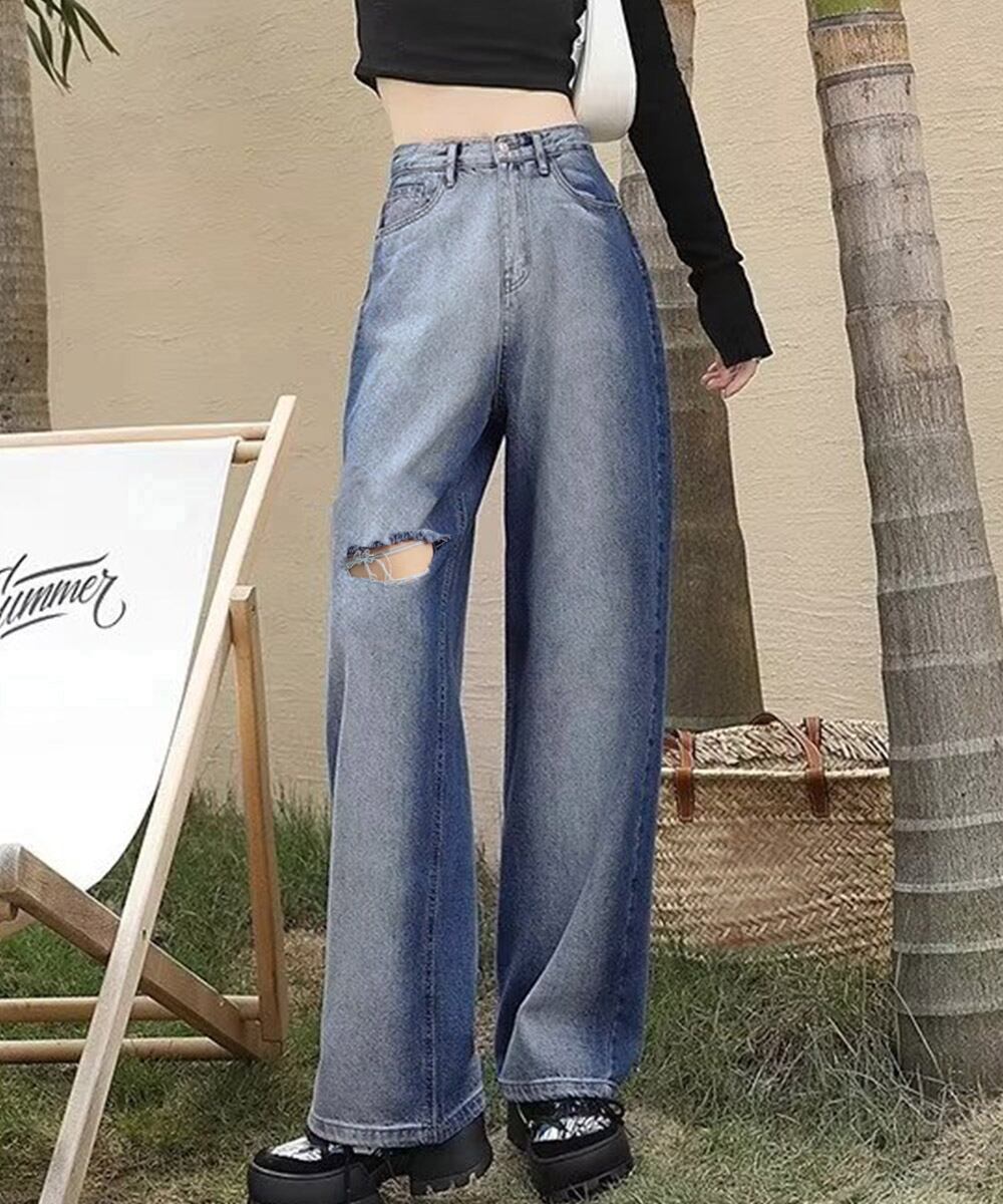 レディース ハイウエスト ストレートパンツ 着やせロングパンツ ゆったり ウォッシュジーンズ カットアウト デニムパンツ