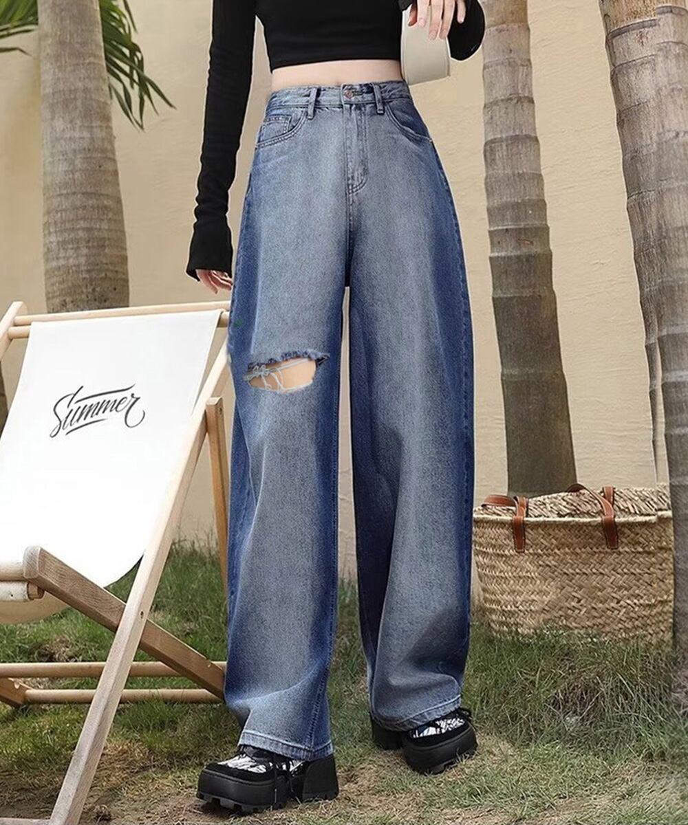 デニムワイドパンツ サイドダメージ韓国風
