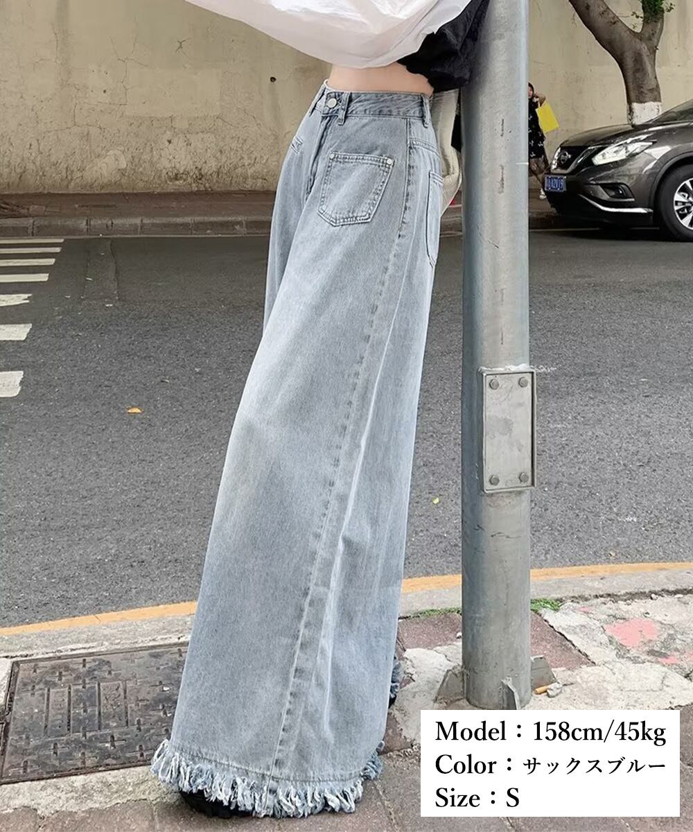 ワイドデニムパンツ 裾フリンジ ジーパン