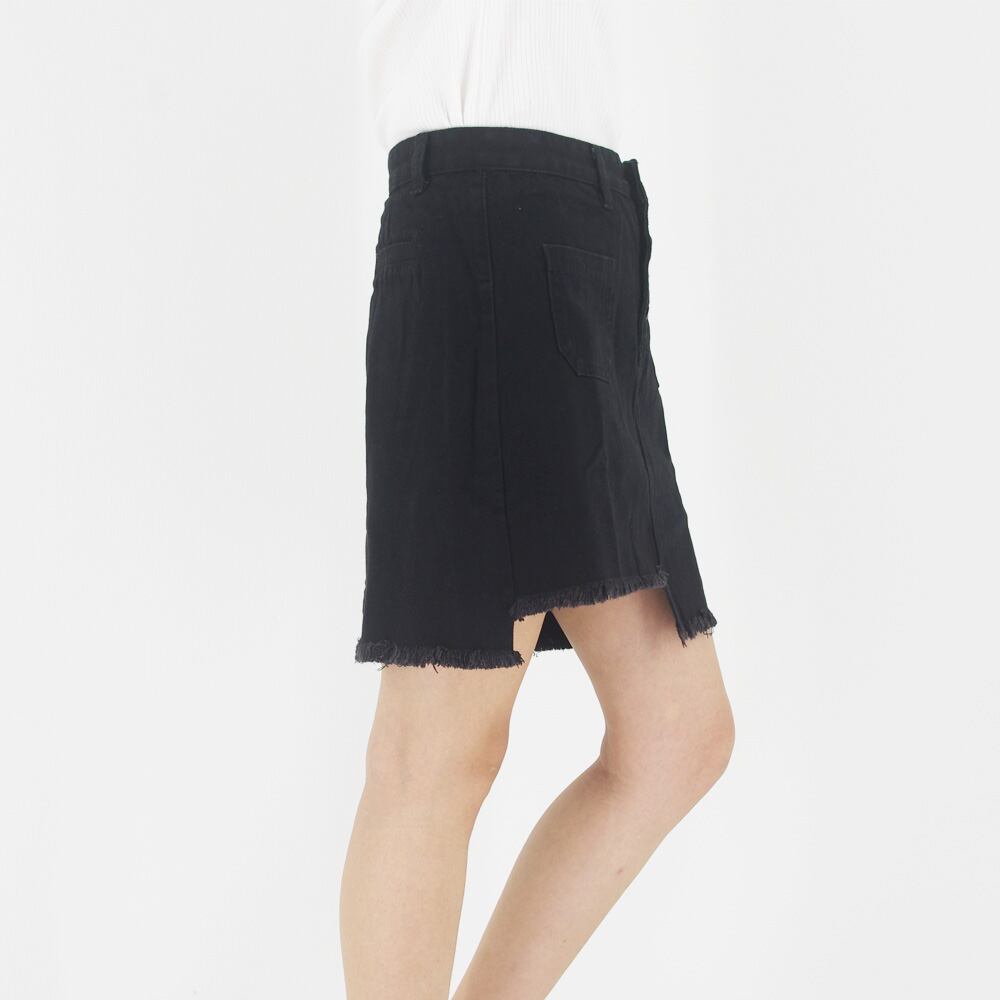 左右非対称のデザインと擦り切れたフレイドヘムがポイント
