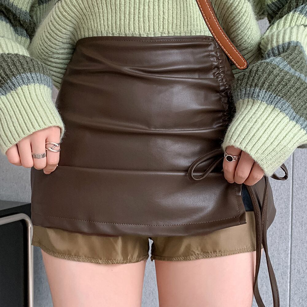レディース ギャザー ハイウエスト 台形スカート 美脚脚長 韓国 フェイクレザースカート 黒 ミニ丈 ボトムス 着やせ