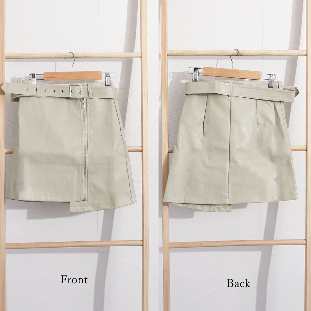 ハイウエストと不規則のデザイン、微光沢の濡れ感のあるフェイクレザー生地を使用したミニススカート