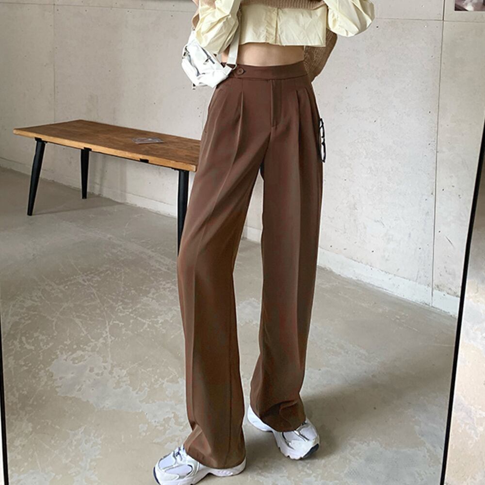 ロングパンツ ハイウエスト ストレートスーツパンツ ポケット付き タック入り ワイドスラックス 通勤 お洒落 韓国