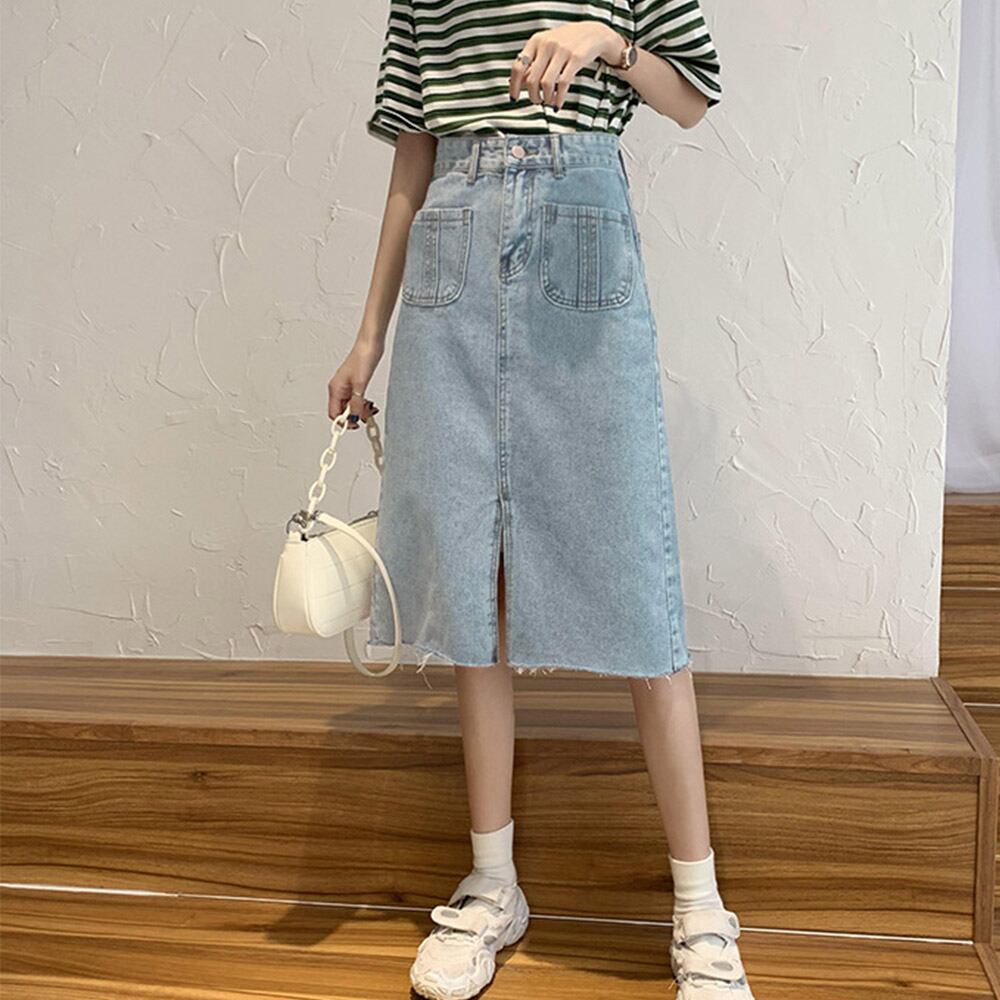 デニムスカート Aライン 裾フリンジ レディース スリット ボトムス 膝下丈