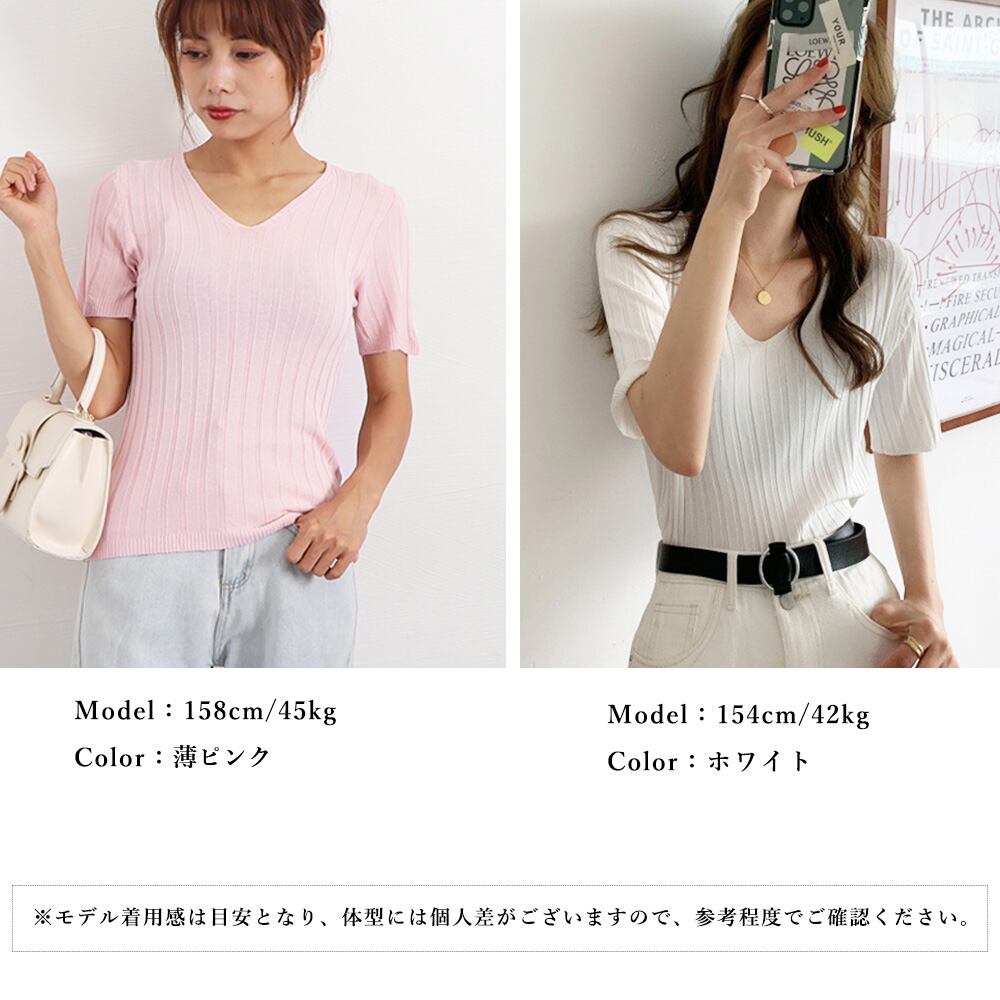 ボディコンシャスなリブ編みで美しく見せる広めのVネックサマーニットプルオーバーです