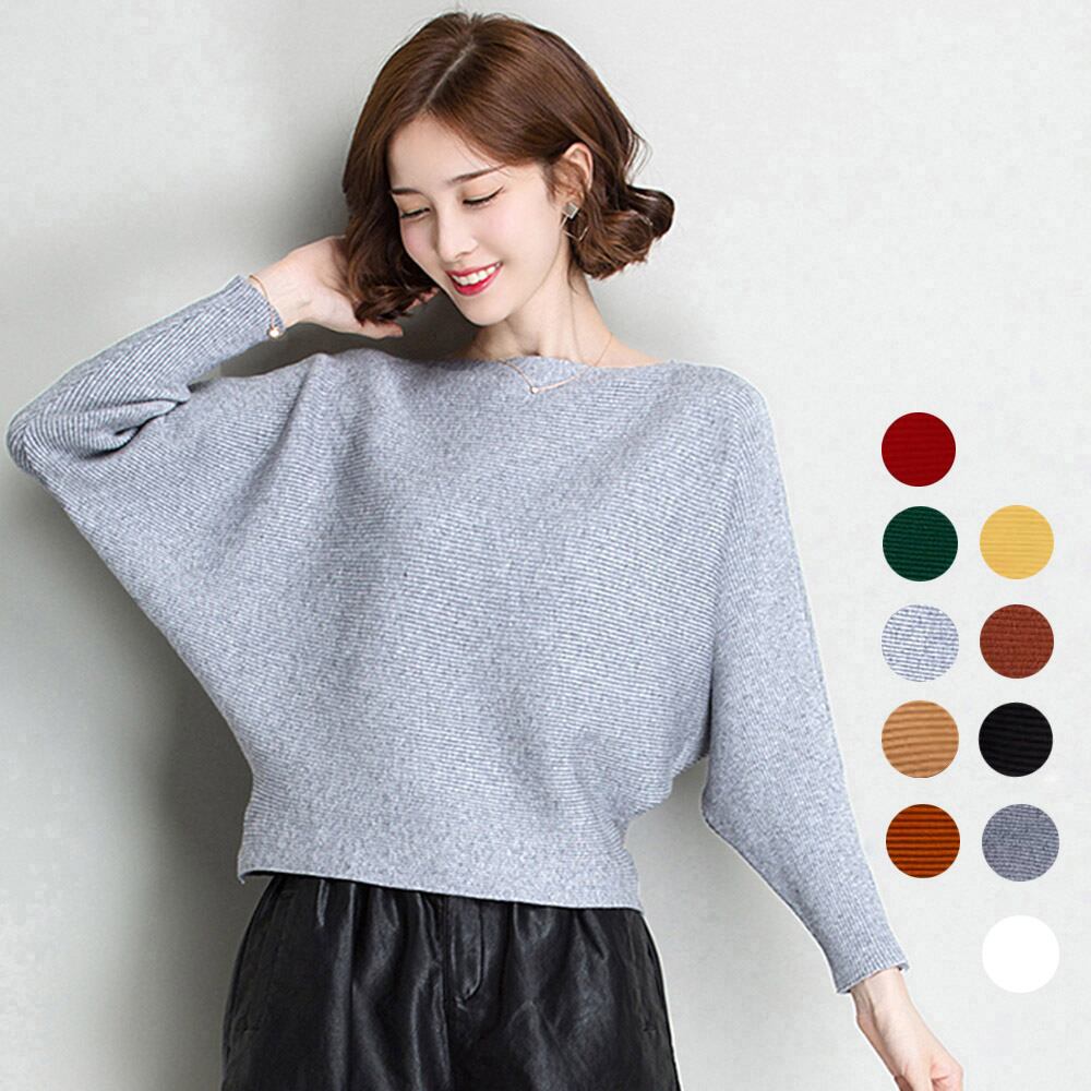 レディース リブニット きれいめ 韓国ファッション セーター 柔らかい ニットソー 無地 大人カットソードルマンスリーブ