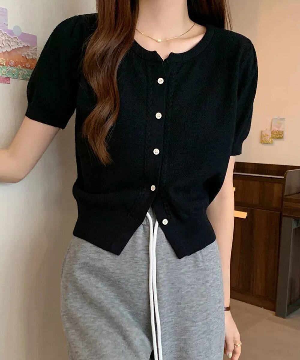 レディース ニットトップス ショート丈 クールネック 薄手 半袖 サマーカーディガン カジュアル オフィス おしゃれ