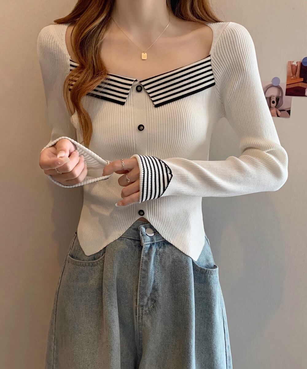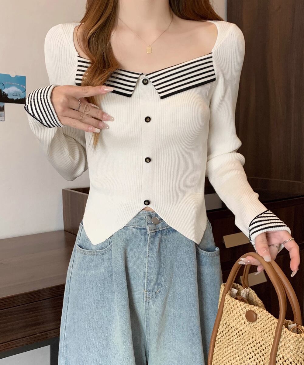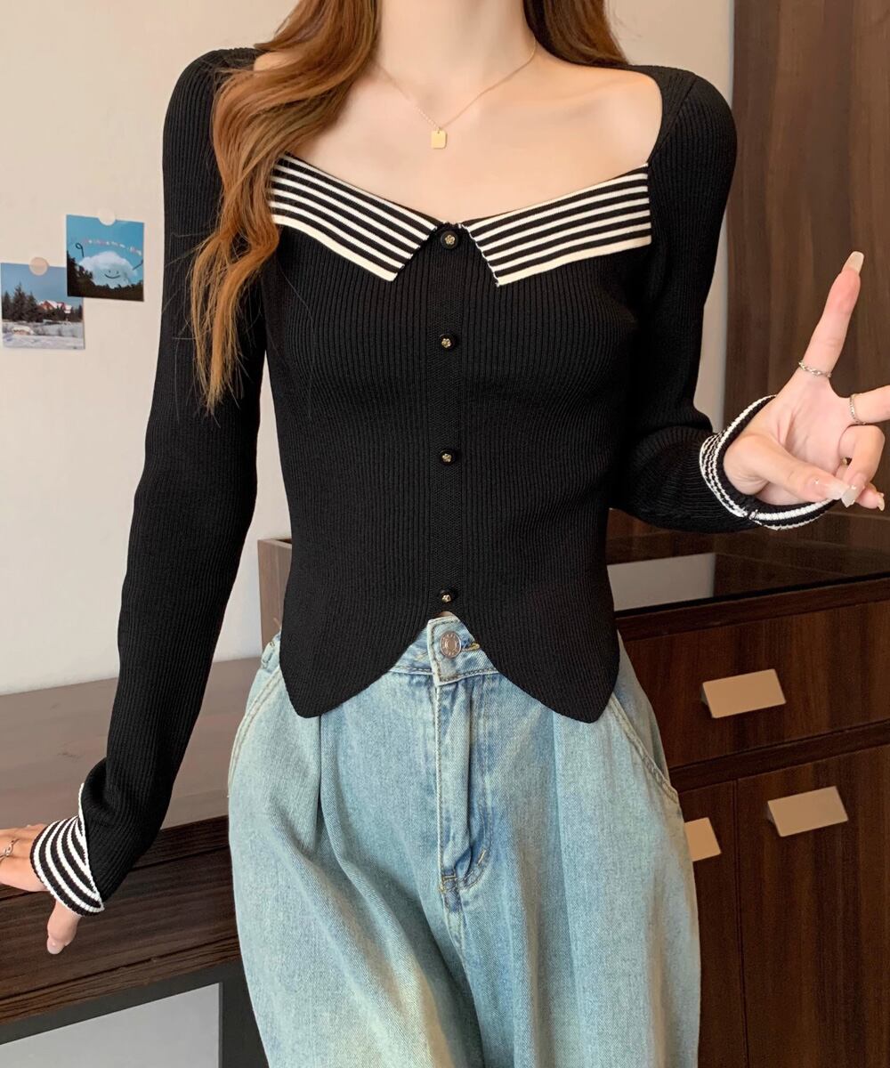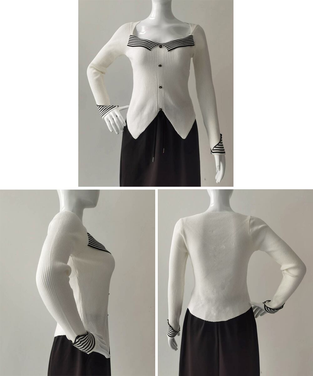 レディース 長袖 着やせ ニットウェア バイカラー フェイクボタンニット おしゃれ 普段着ニットセーター デコルテ美人