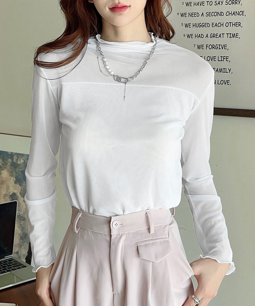 インナー大人可愛い モックネック春秋服 透け感トップス大人