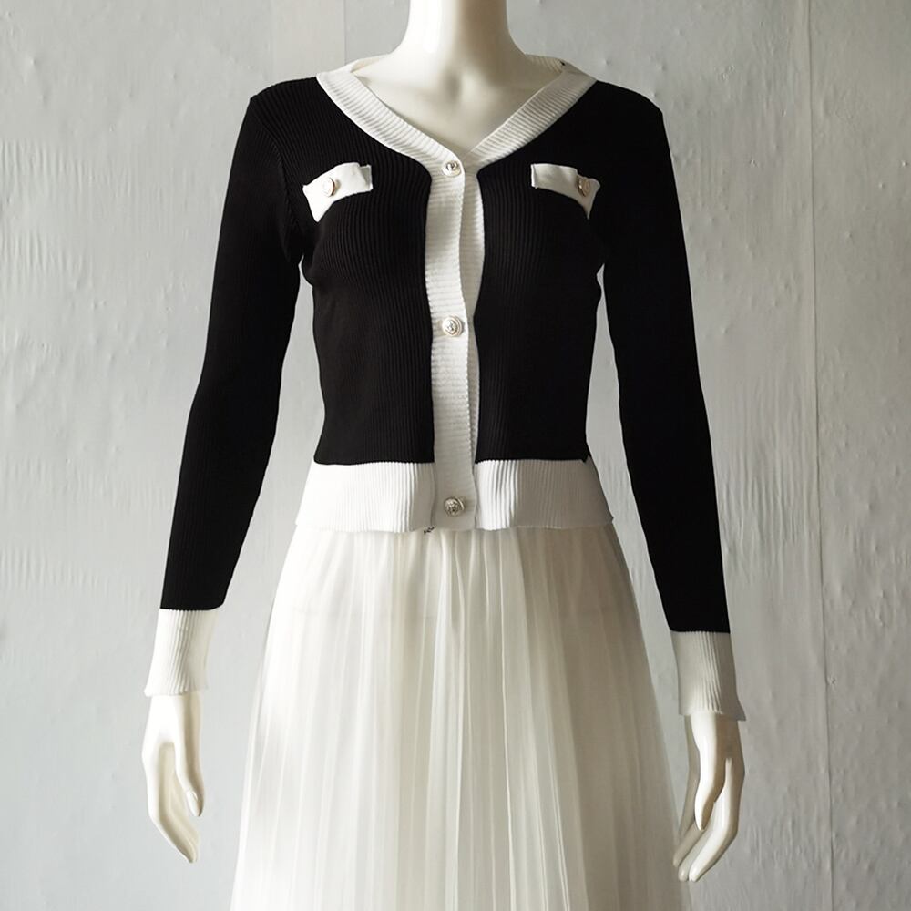 襟から前立ての部分が配色になった、バイカラーデザインがポイントのニットカーディガン