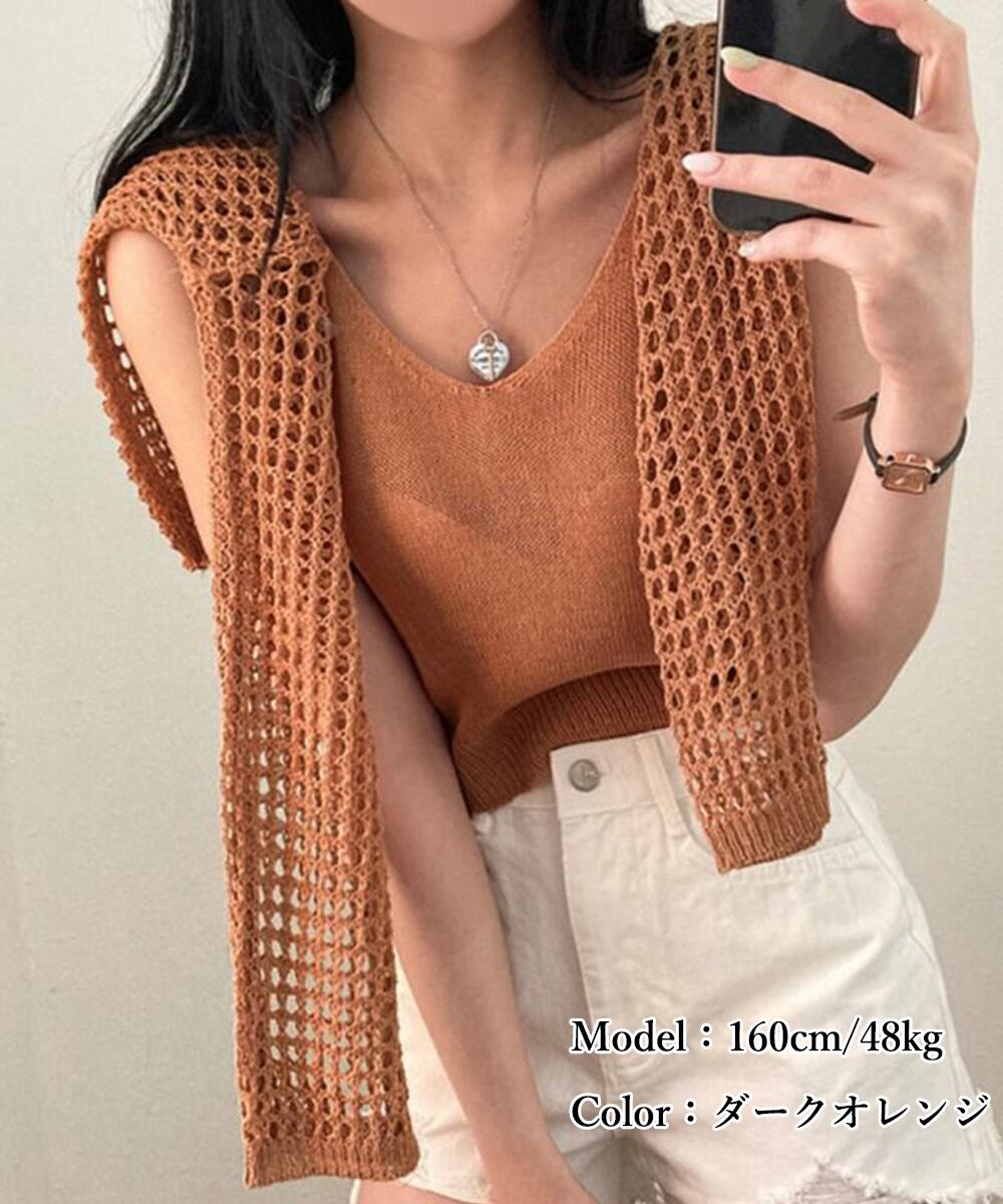 ショート丈ニットトップス セットアップ 透かし編みトップス ニットキャミ 体型カバーニットアンサンブル カジュアル韓国風
