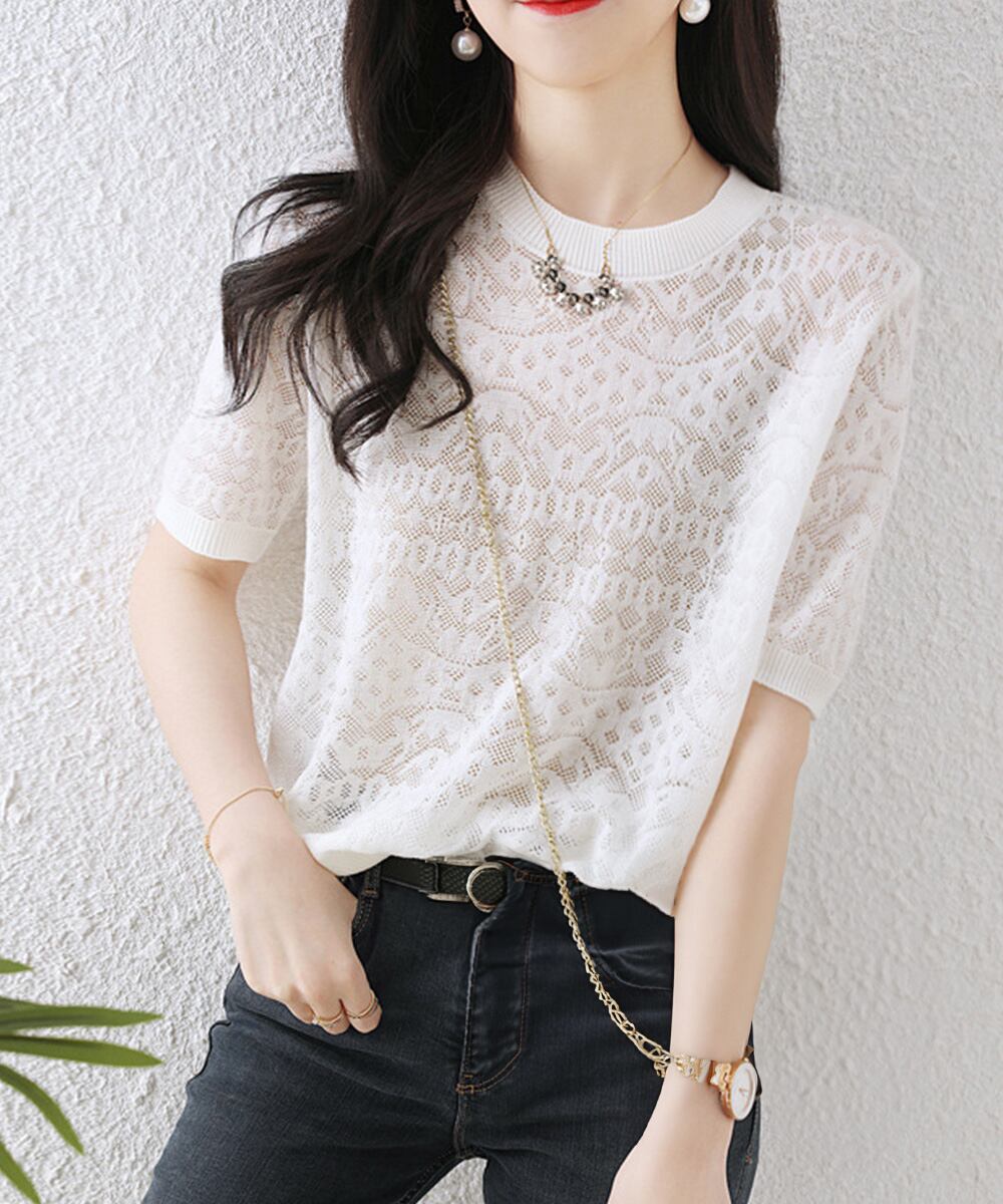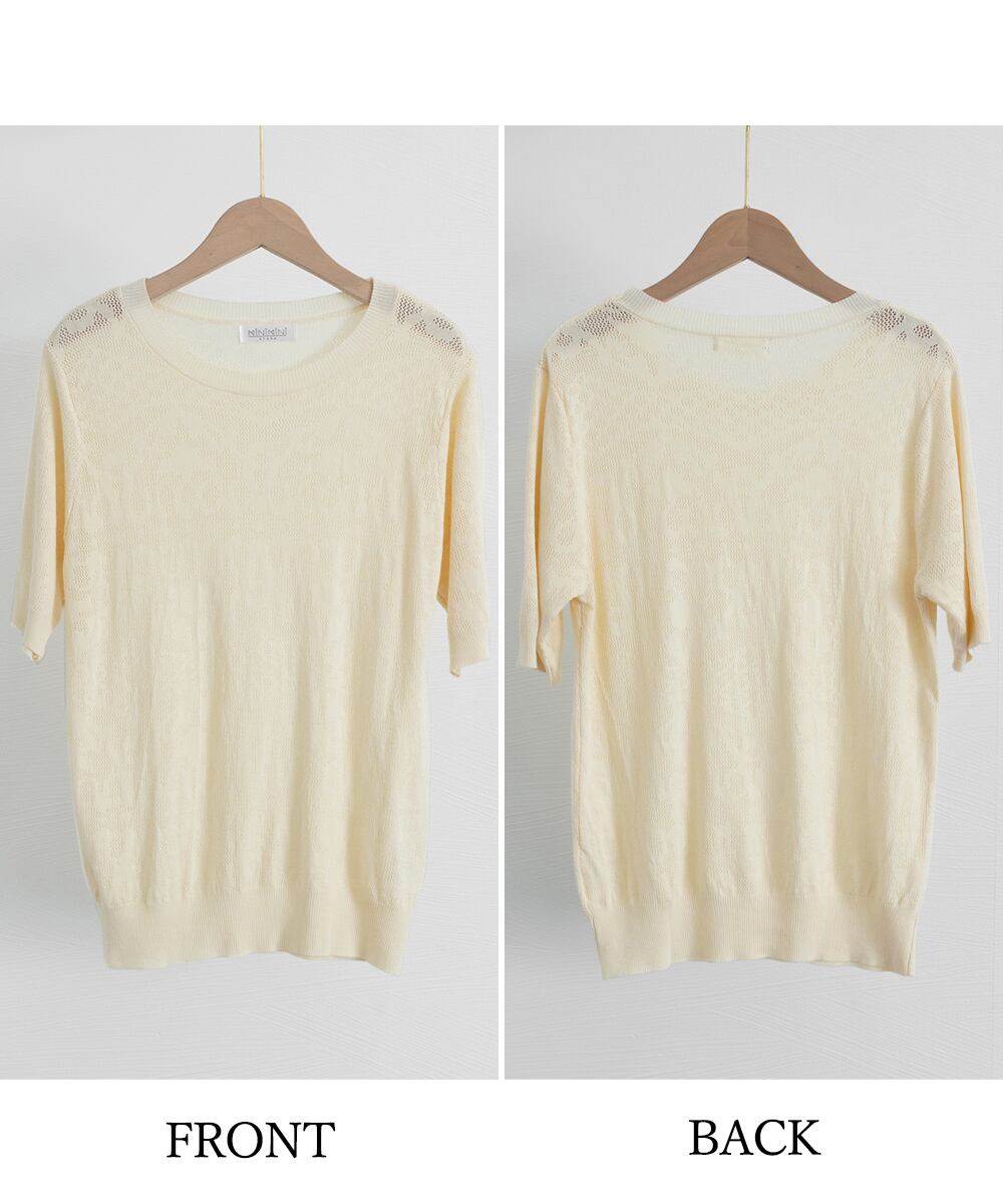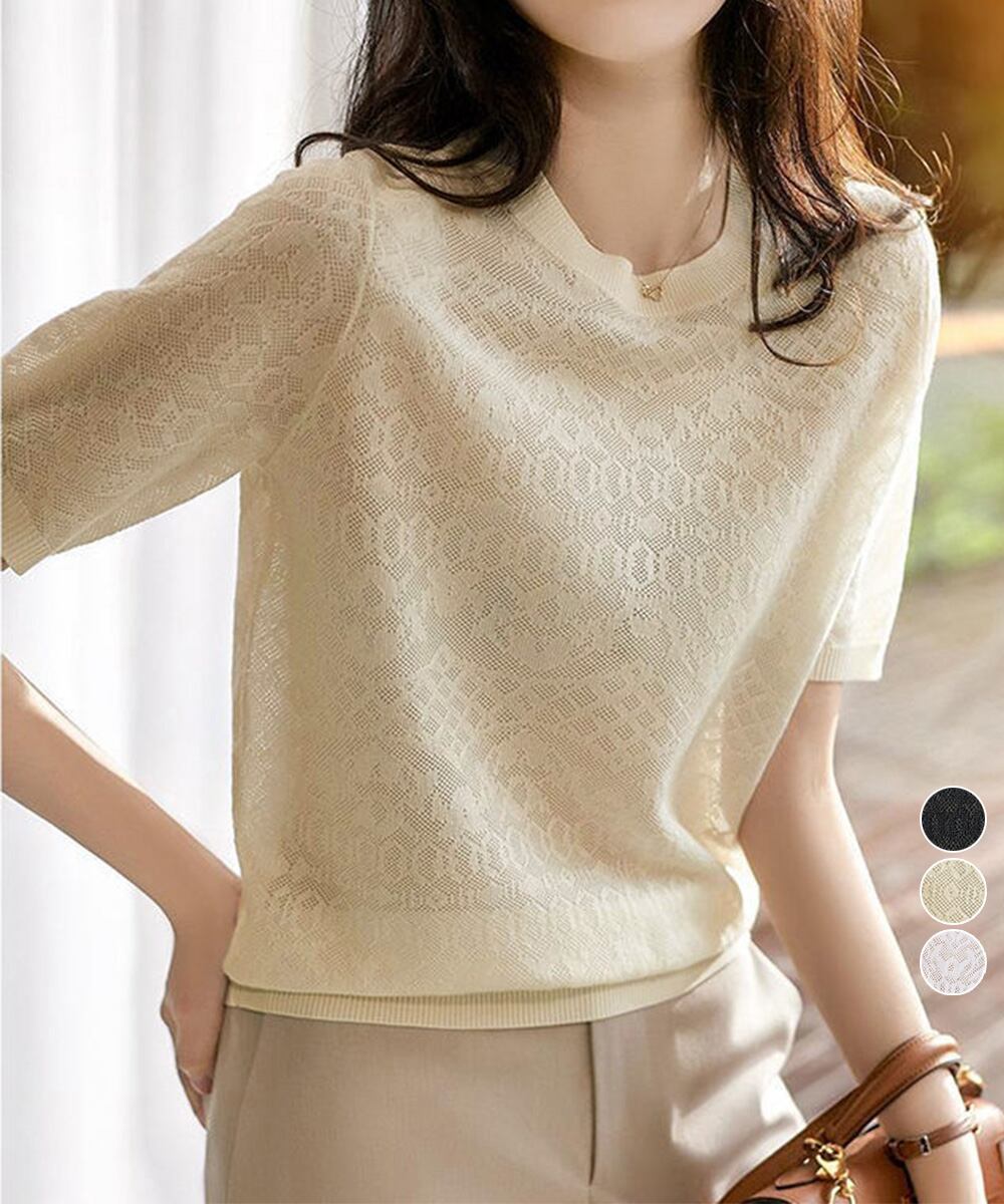 柔らかな風合いの透かし編みが、レディライクな華奢感をだしてくれるジャガードニットトップス