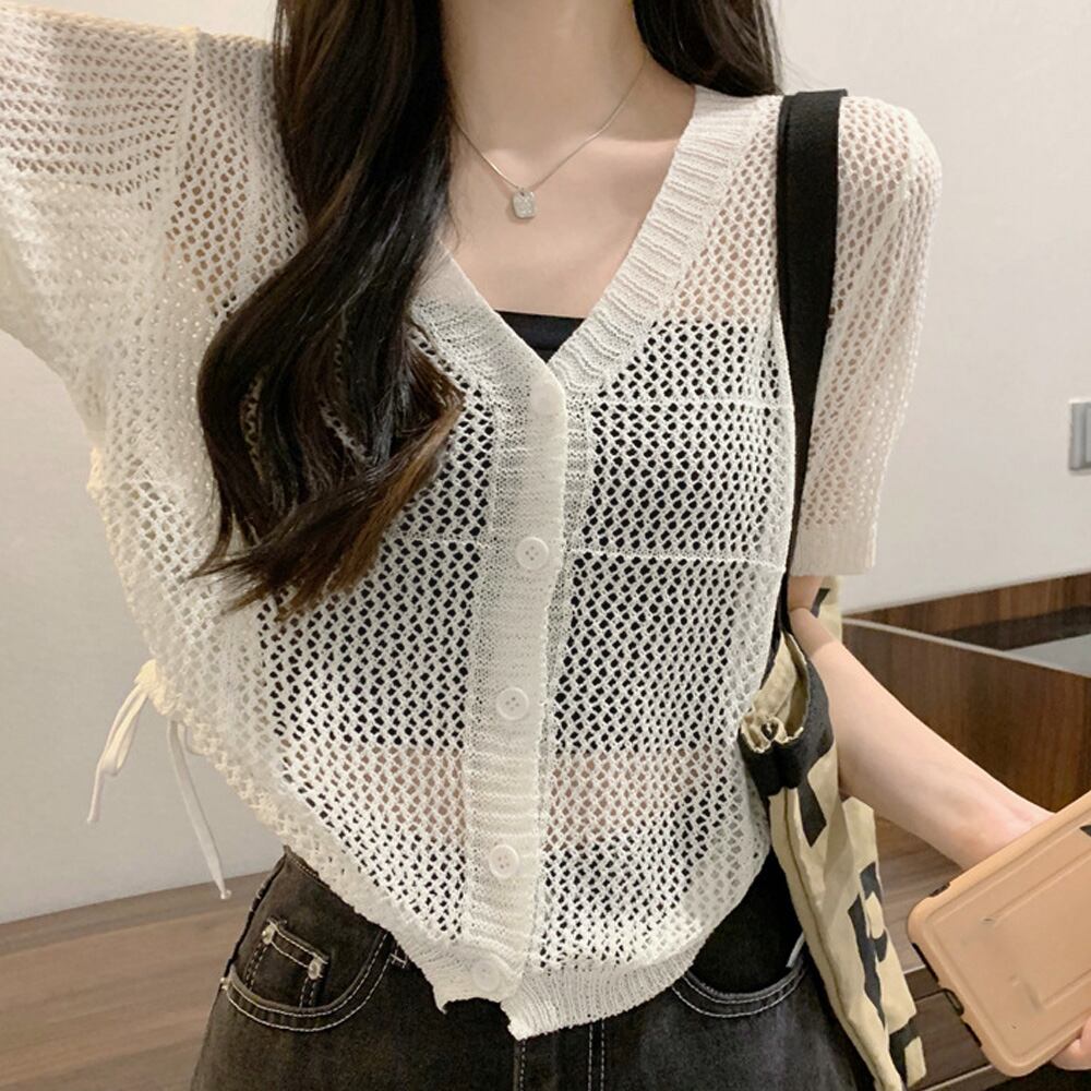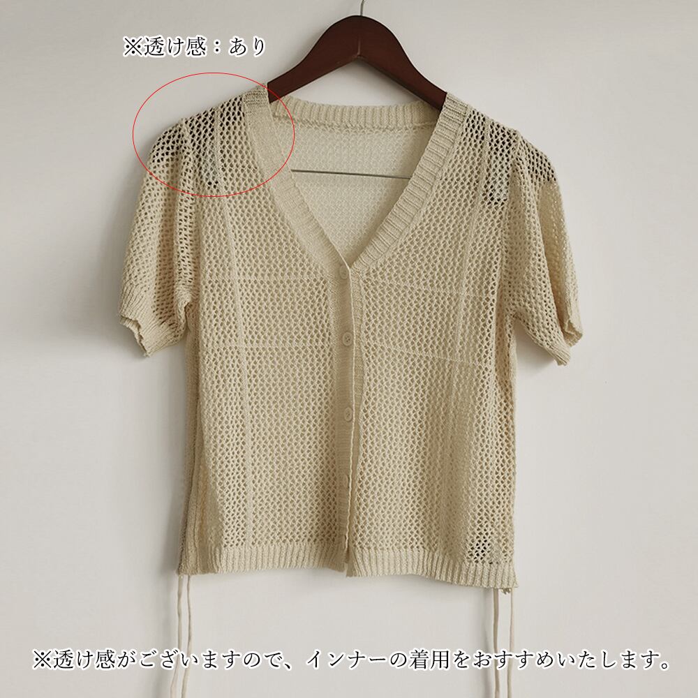 レディース かわいい サマーカーディガン 韓国風 着やせ 透かしトップス 無地 薄手 Vネック サマーニットトップス 夏