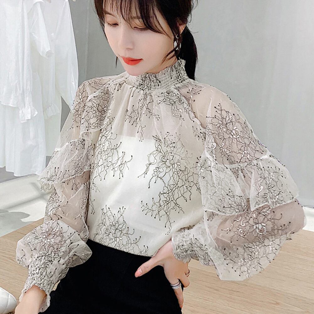 フリル フレアトップス 透け感 肌見せ 大人可愛い花柄ブラウス ハイネック ぽわん袖春夏長袖 薄手ブラウス 韓国おしゃれ