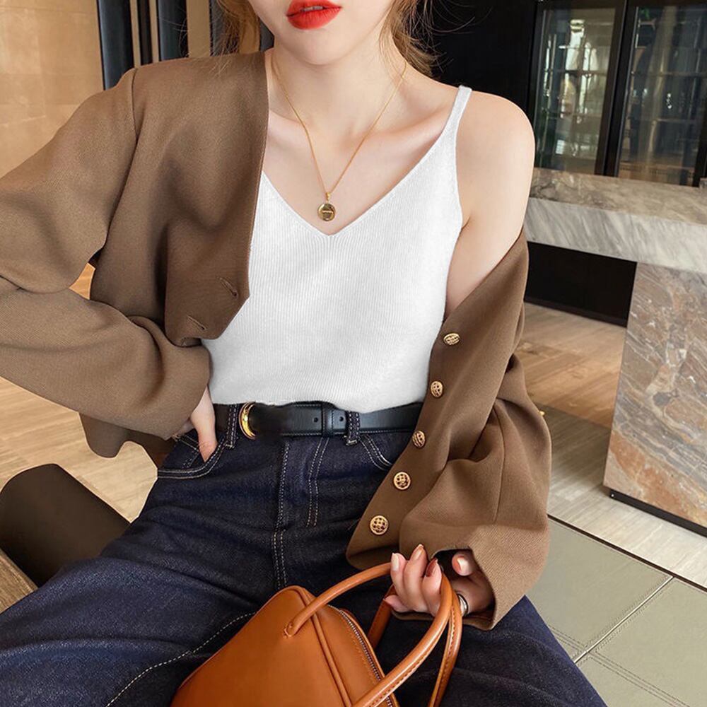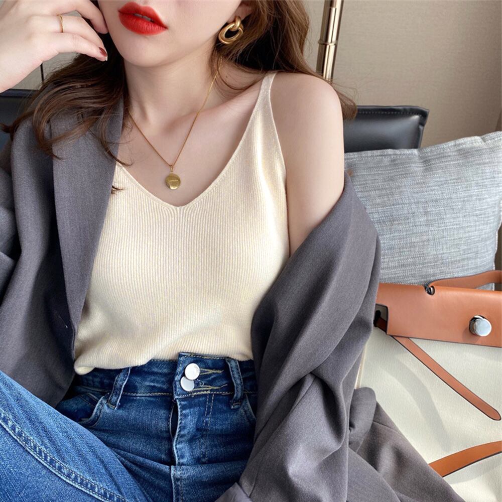 フロントのVカットデザインがポイントの細ストラップニットキャミソール