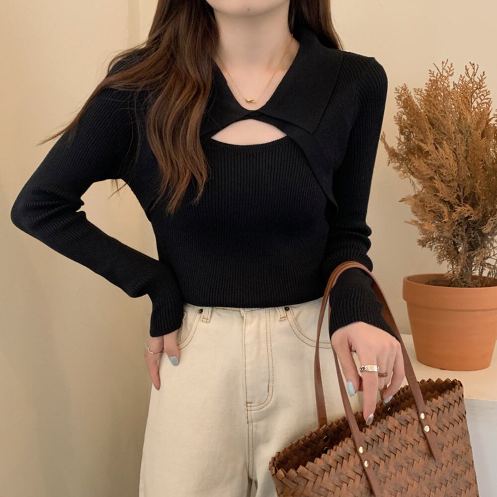 フロントカットアウトデザインが目を惹く襟付きニットプルオーバー