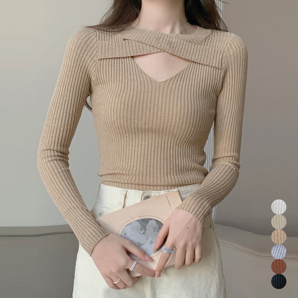 セクシーなフロントクロスと胸開きデザインのニットトップス