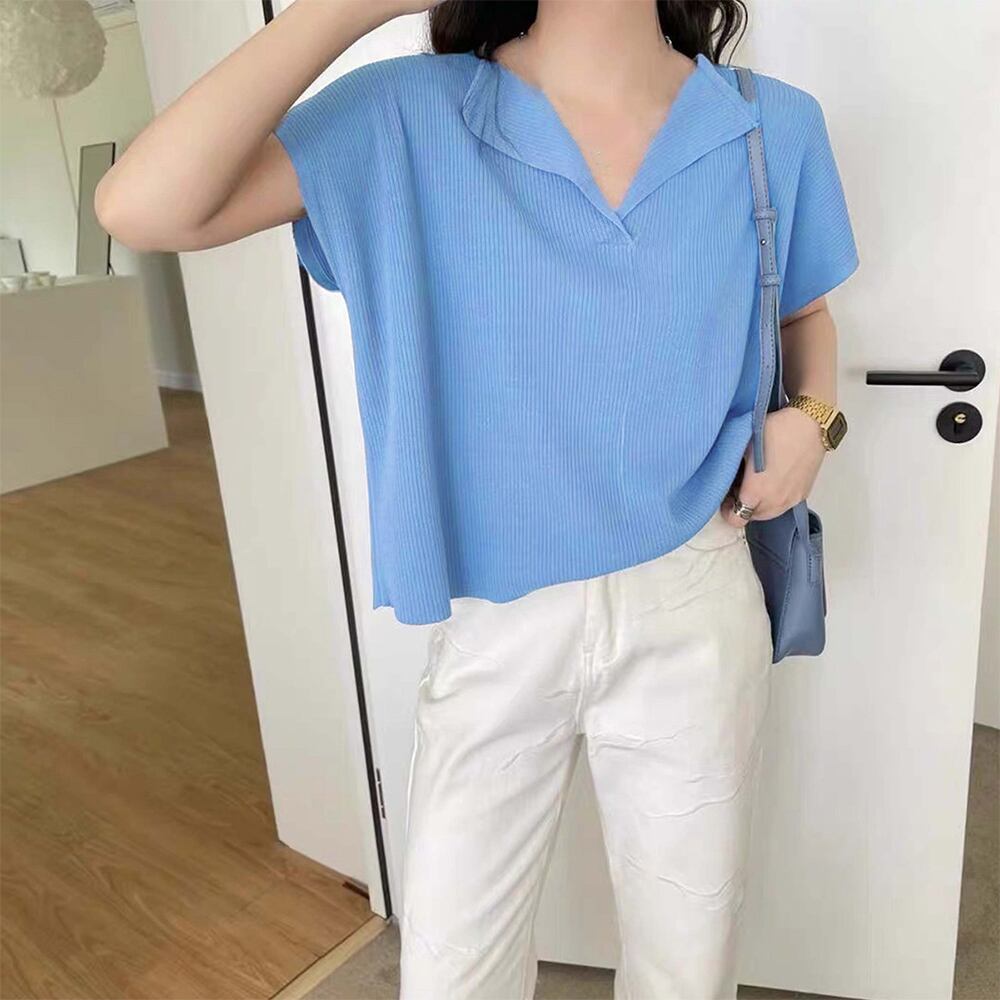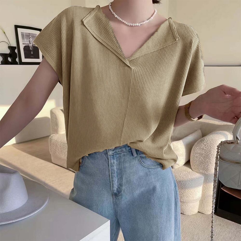 レディース vネック ニットTシャツ ゆったり 半袖トップス 着やせ リブニット 無地 カジュアル ニットカットソー