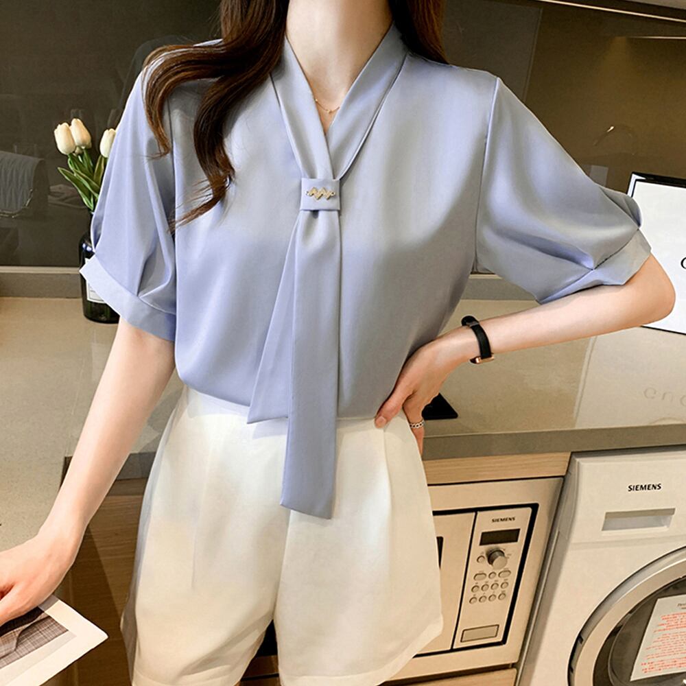 ボウタイブラウス 半袖 レディース 無地
