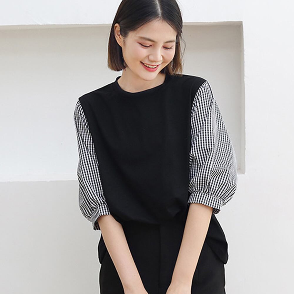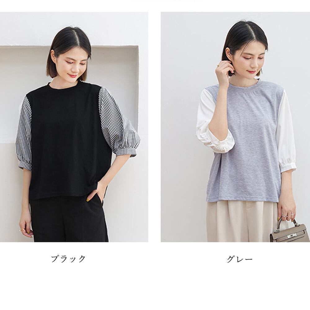 5分袖 Tシャツ 切替 レディース ゆったり チェック柄 異素材ボリューム袖 プルオーバー 大人フェミニン カジュアル