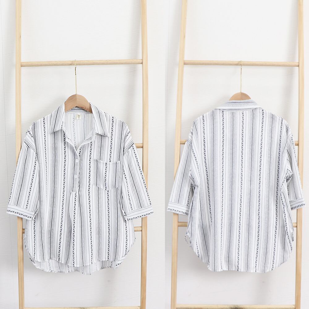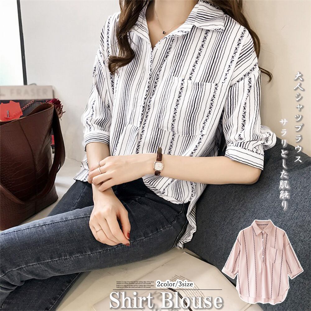 サラリとした肌触りの五分袖Vネックストライプシャツブラウスです