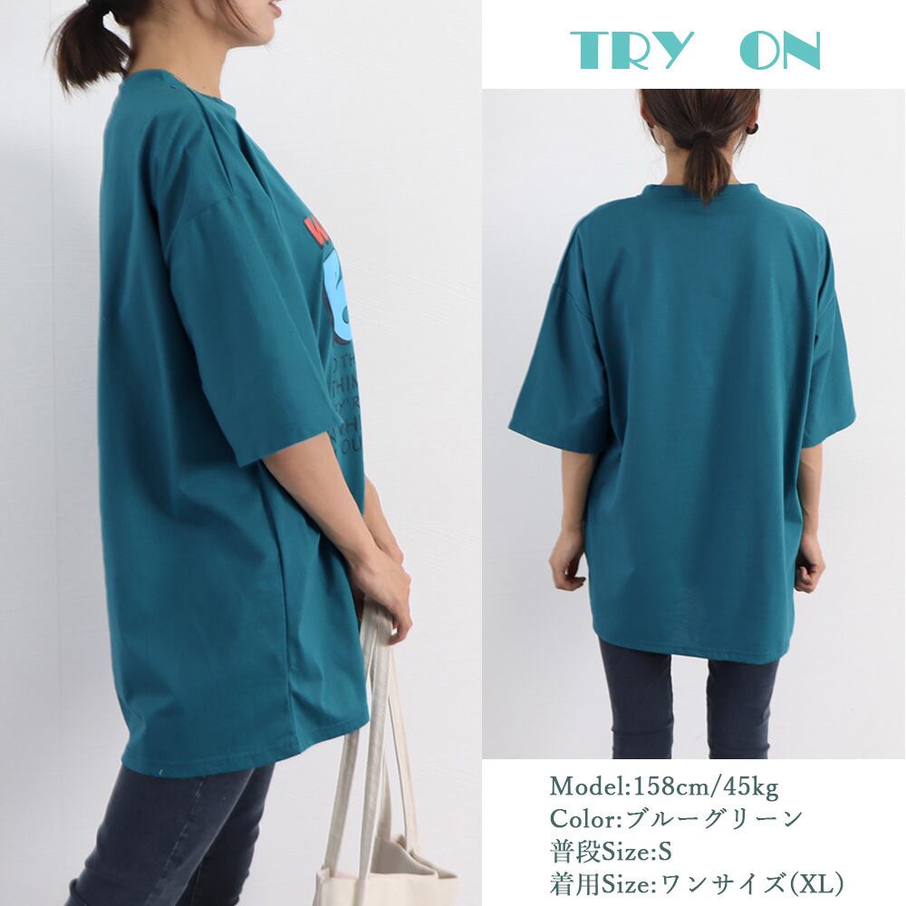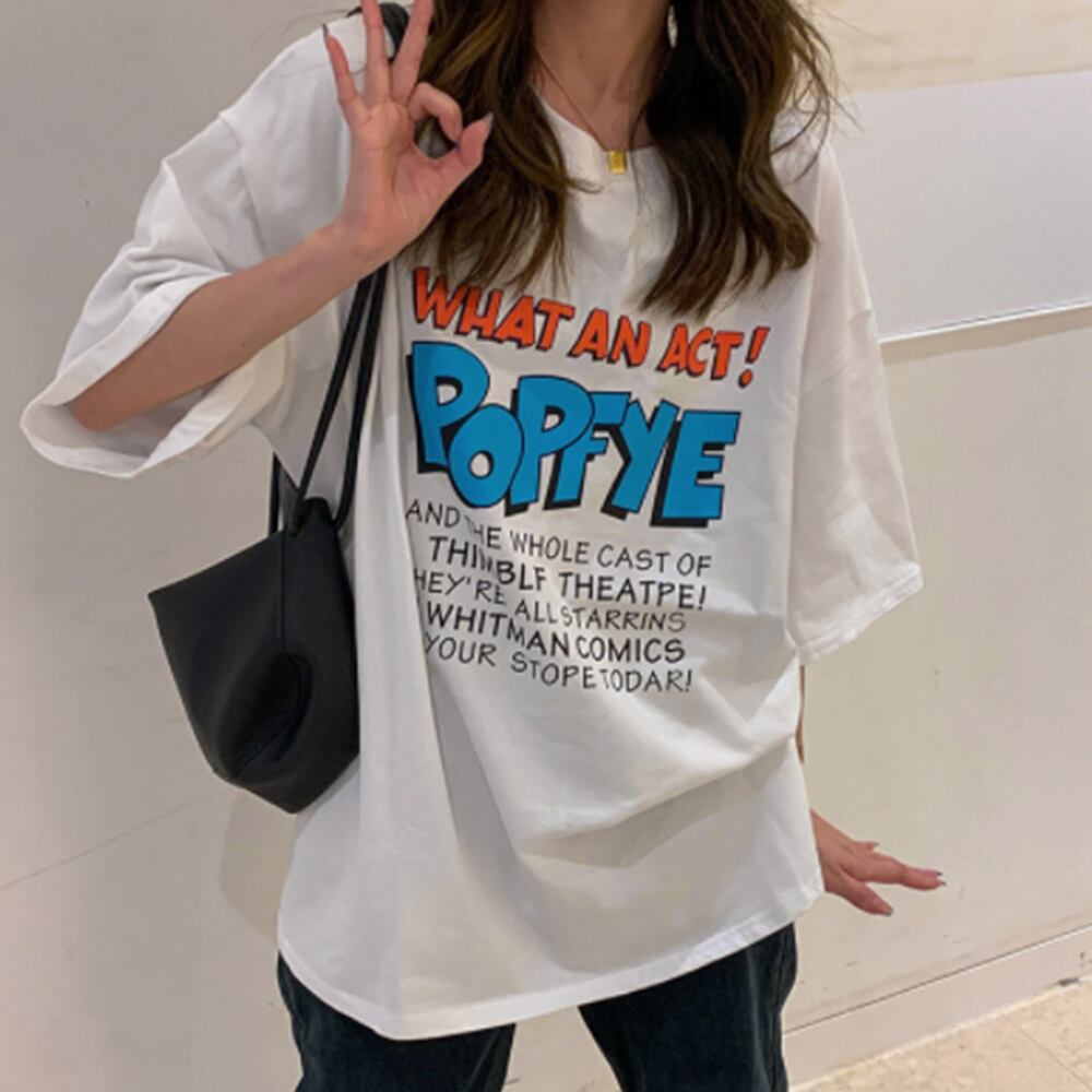 トップス ルーズ 英字ロゴ ロングTシャツ 着やせ 体型カバー プリントTシャツ 半袖 オルチャン 韓国ファッション夏服