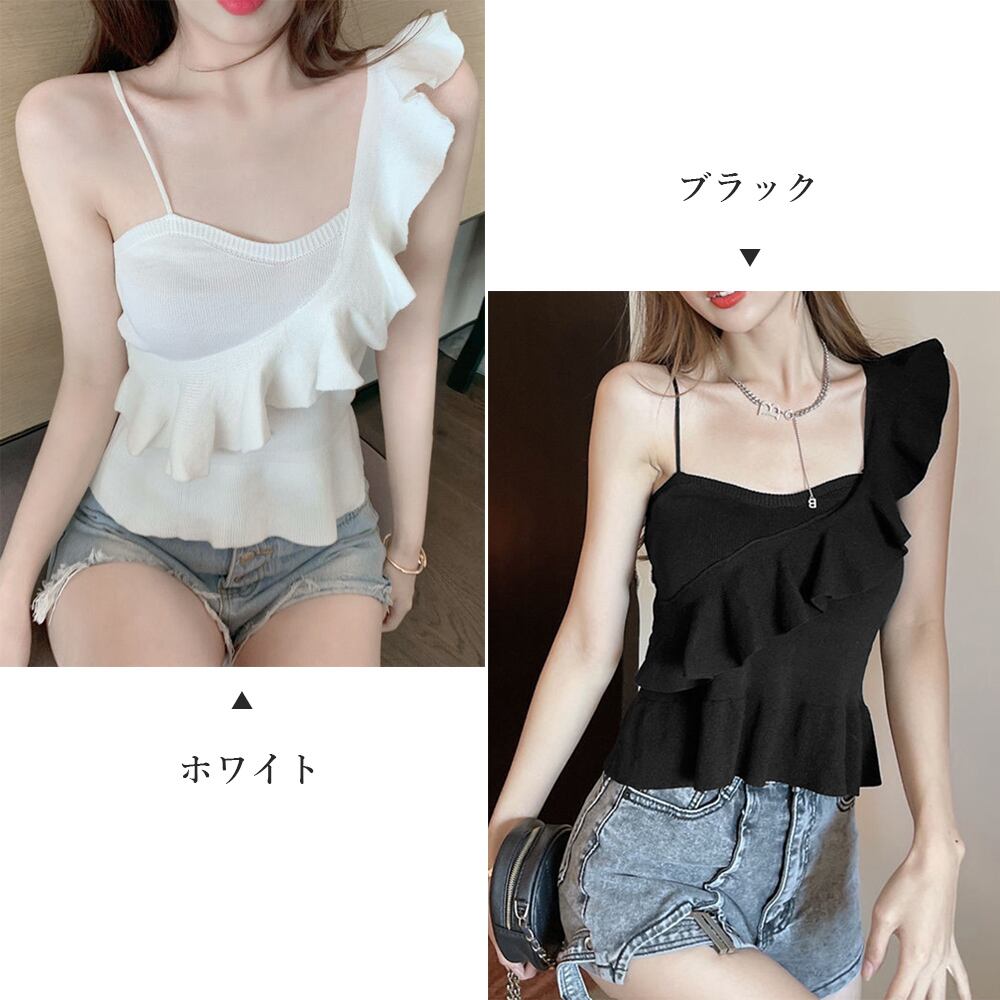 レディース ノースリーブトップス オフショルダー リブニットタンク 肩出し アシンメトリー サマーニットキャミ