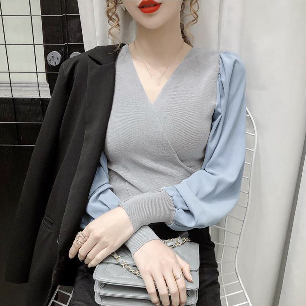 レディース カシュクール ニットセーター パフスリーブ ニットソー Vネック ニットウェア