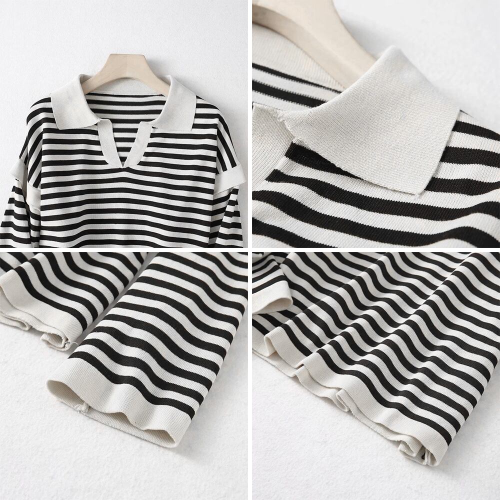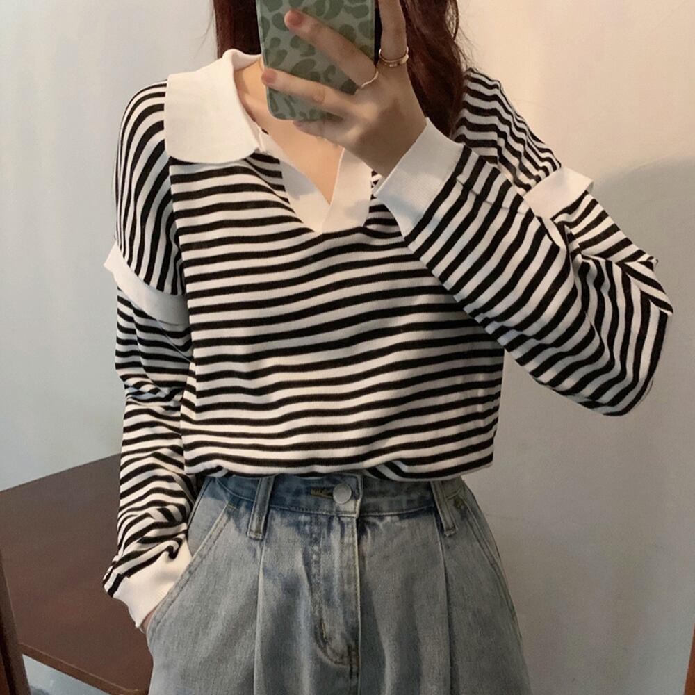 ボーダーニット 襟付きトップス 着やせ