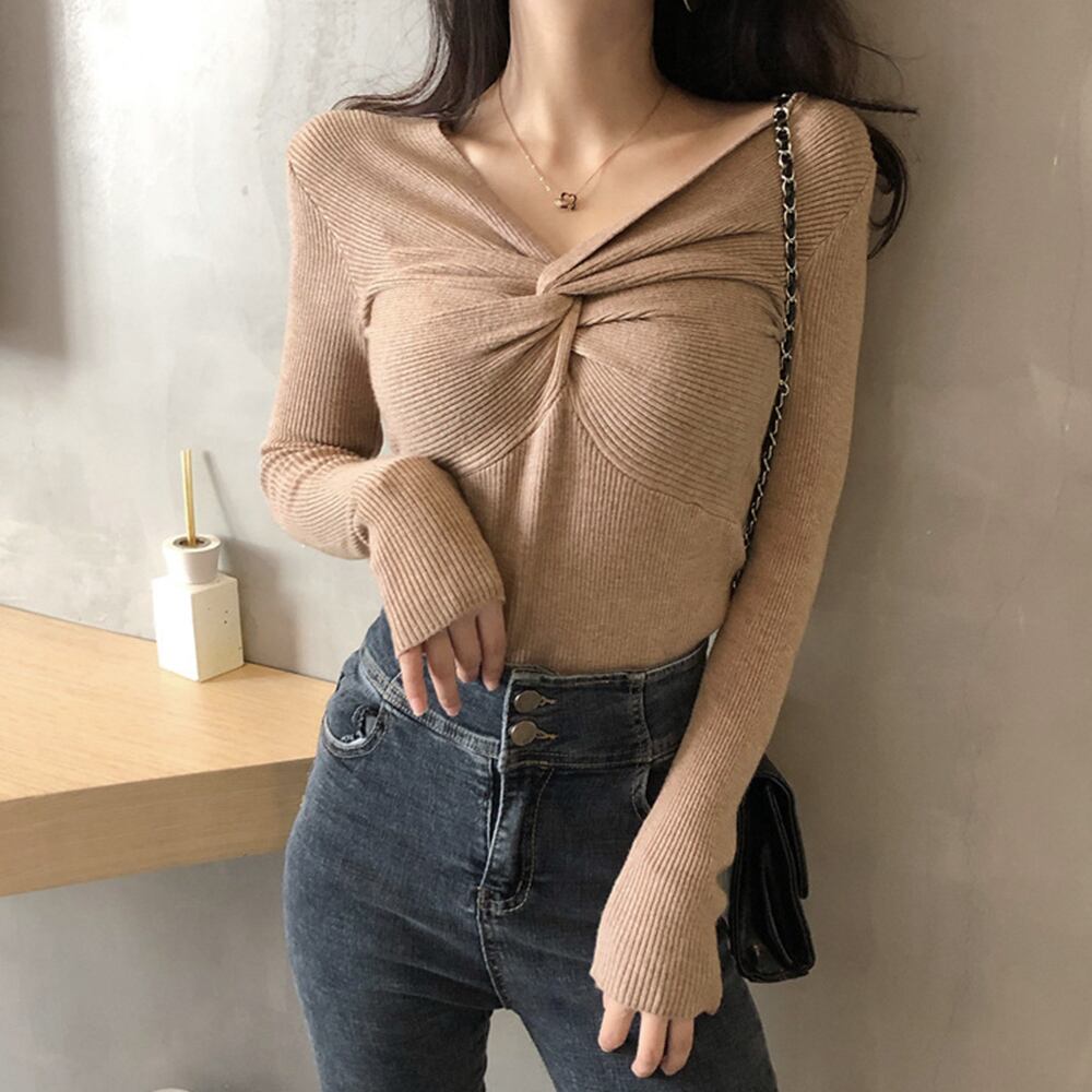 ひねり Vネックニットソー ストレッチプルオーバー 長袖ニットセーター薄手 春秋冬インナートップス 細見えシンプルニット