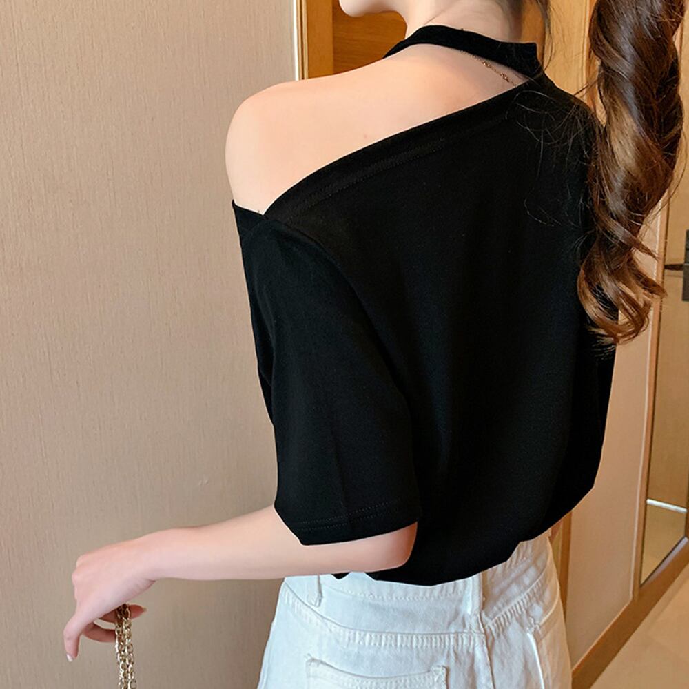 英字ロゴプリントが施されているお洒落なワンショルダーtシャツ