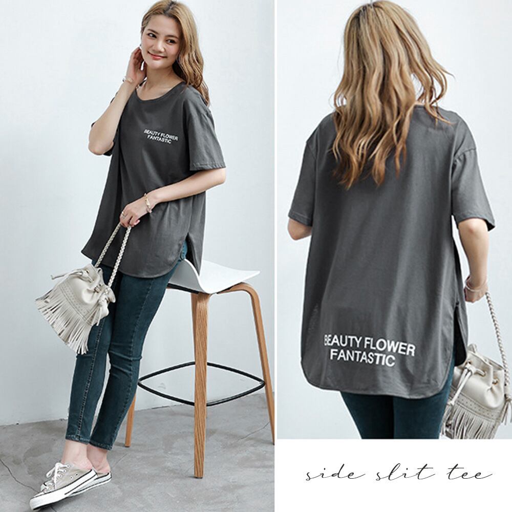 英字ロゴカットソー サイドスリット 体型カバー ゆったりトップス 半袖プルオーバー ビッグシルエット おしゃれ 夏服