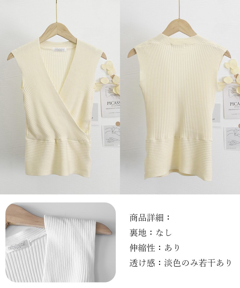 レディース クロップド丈 ノースリーブ ニットカットソー 着やせ セクシー胸元 カシュクール風 ニットウェア 春秋夏