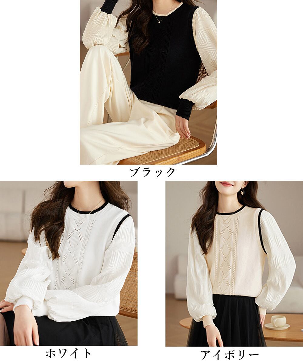 シフォン袖 切り替えニットトップス パフスリーブ ニットプルオーバー 長袖 レイヤード風ニットブラウス クルーネック黒