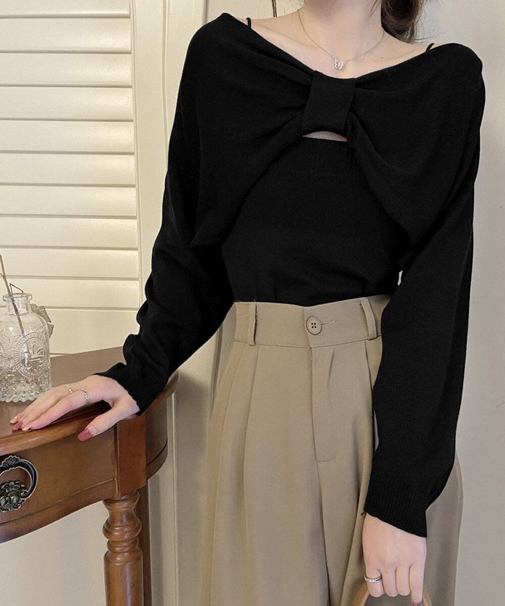 レディース カジュアル ニットアンサンブル ショート丈ニットトップス インナーキャミ2点セット 着回し 長袖プルオーバー