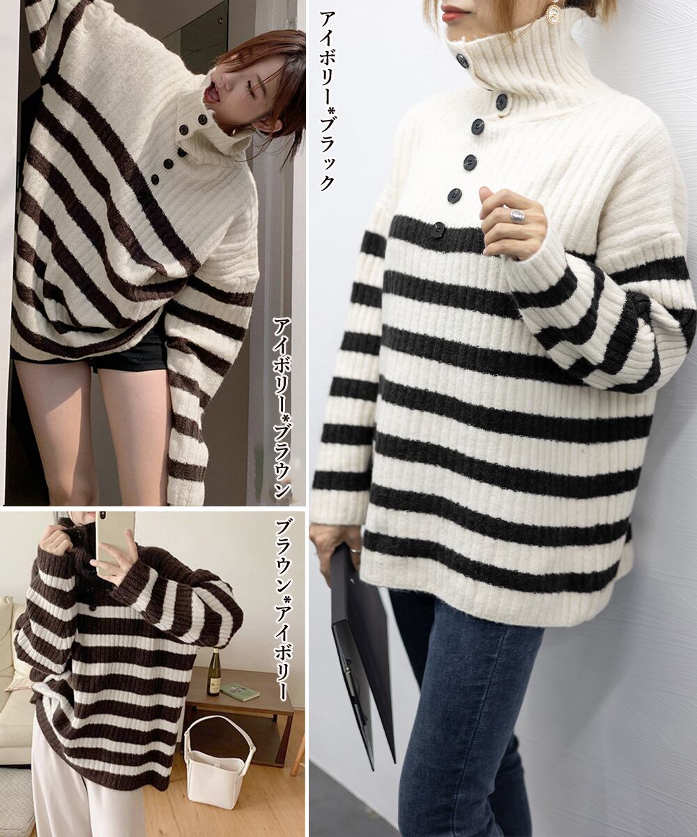 ハイネック仕様は優しくてエレガントな印象、小顔魅せも期待できる秋冬定番のボーダー柄ニットトップス