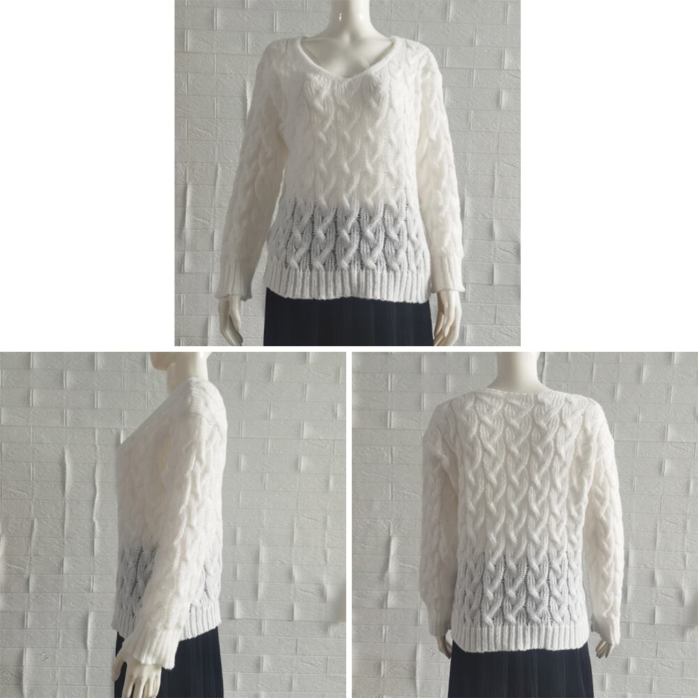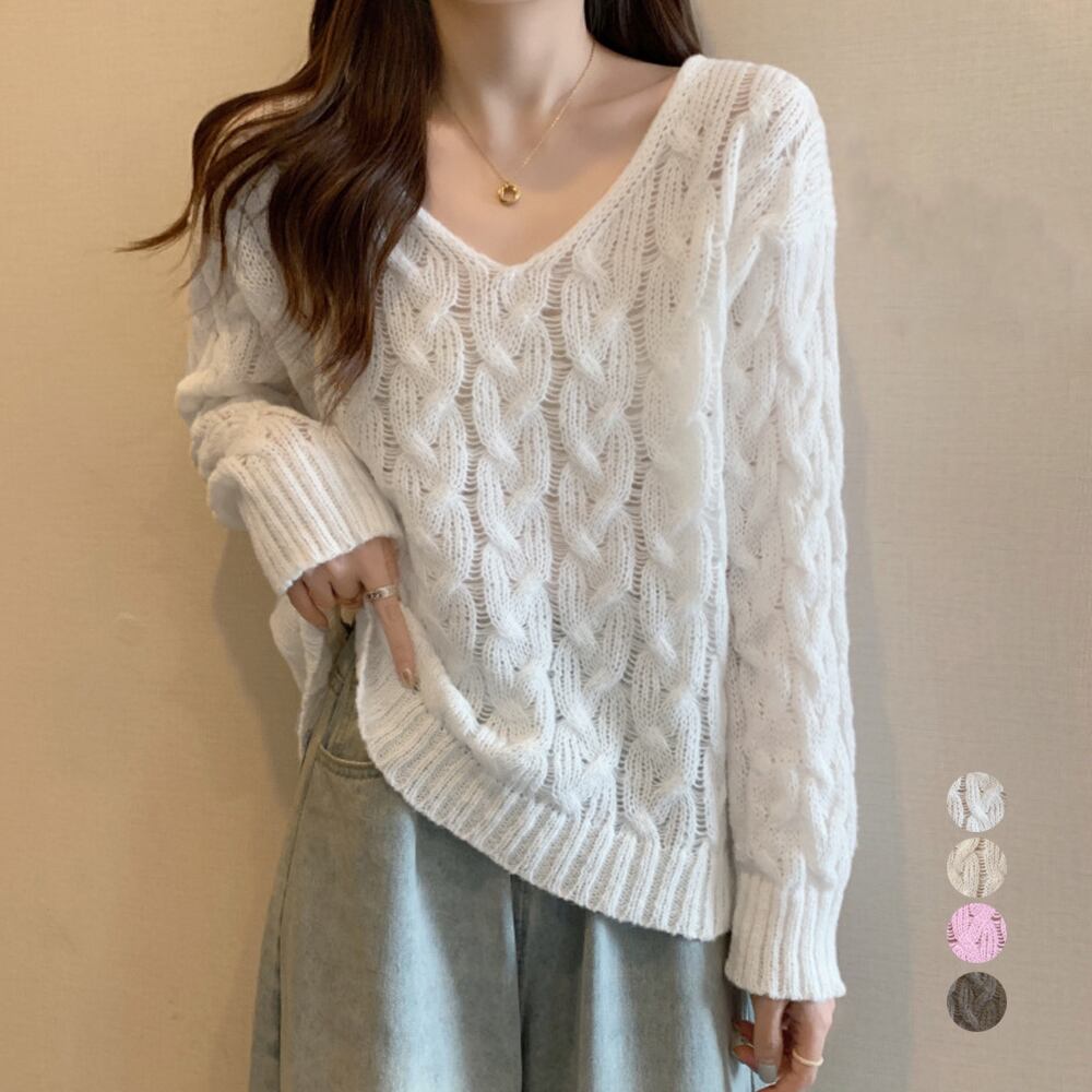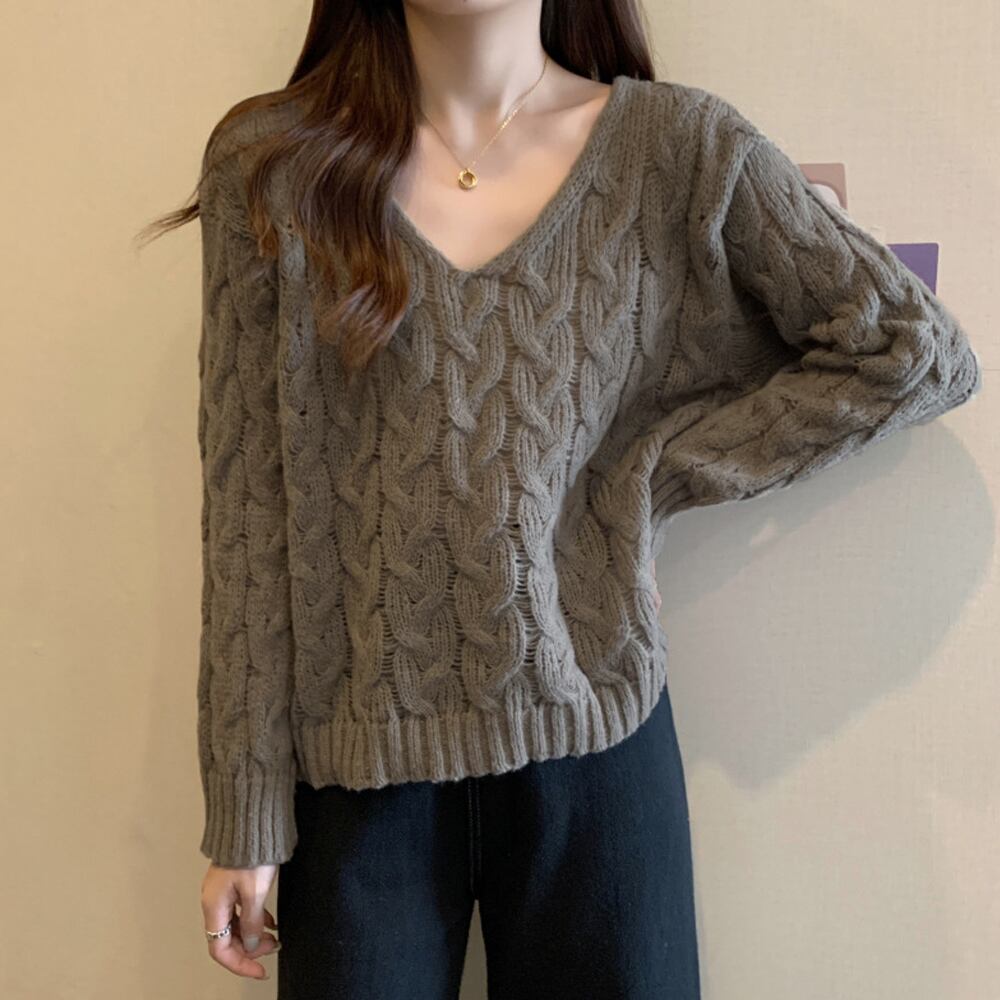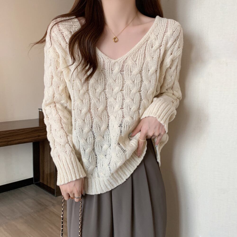 ケーブル編みニットトップス Vネック春秋